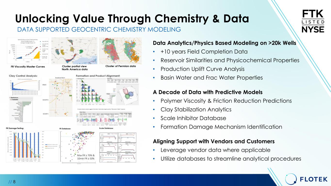 // 7 • Prescriptive Chemistry Management (PCM)TM • Proprietary energy chemistry solutions • Experienced chemistry energy team • Customized solutions to each well’s geology • AI Driven Analytics from >20,000 wells • Field Correlated Diagnostics • +170 Patents * Data derived from 2019-2023 Enverus Prism Platform (1,878 Permian wells) DELIVERING THE BEST UPLIFT PERFORMANCE IN INDUSTRY 26% INCREASE IN UPLIFT* PERFORMANCE VERSUS COMPETITION Chemistry Technologies: Competitive Advantage
