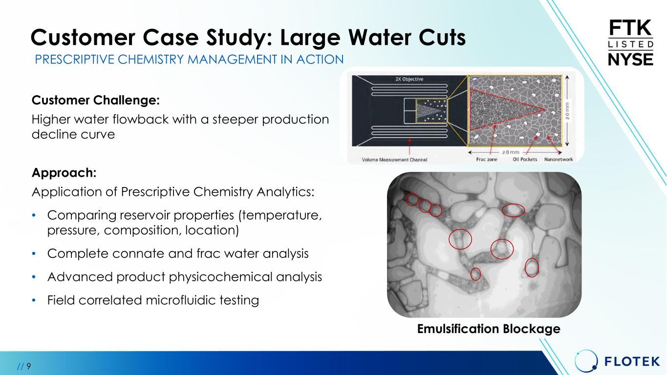 Unlocking Value Through Chemistry & Data Data Analytics/Physics Based Modeling on >20k Wells • +10 years Field Completion Data • Reservoir Similarities and Physicochemical Properties • Production Uplift Curve Analysis • Basin Water and Frac Water Properties A Decade of Data with Predictive Models • Polymer Viscosity & Friction Reduction Predictions • Clay Stabilization Analytics • Scale Inhibitor Database • Formation Damage Mechanism Identification Aligning Support with Vendors and Customers • Leverage vendor data where applicable • Utilize databases to streamline analytical procedures DATA SUPPORTED GEOCENTRIC CHEMISTRY MODELING // 8