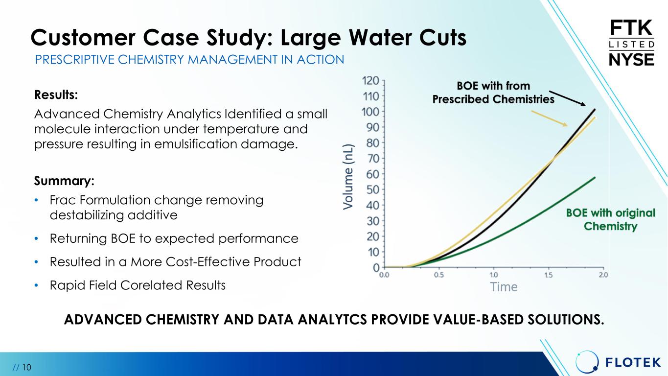 Customer Case Study: Large Water Cuts Customer Challenge: Higher water flowback with a steeper production decline curve Approach: Application of Prescriptive Chemistry Analytics: • Comparing reservoir properties (temperature, pressure, composition, location) • Complete connate and frac water analysis • Advanced product physicochemical analysis • Field correlated microfluidic testing Emulsification Blockage PRESCRIPTIVE CHEMISTRY MANAGEMENT IN ACTION // 9