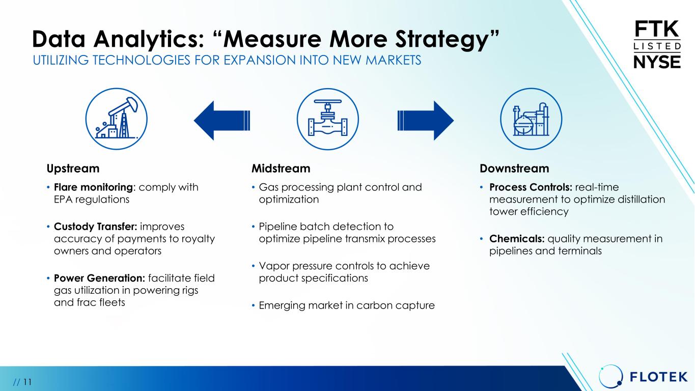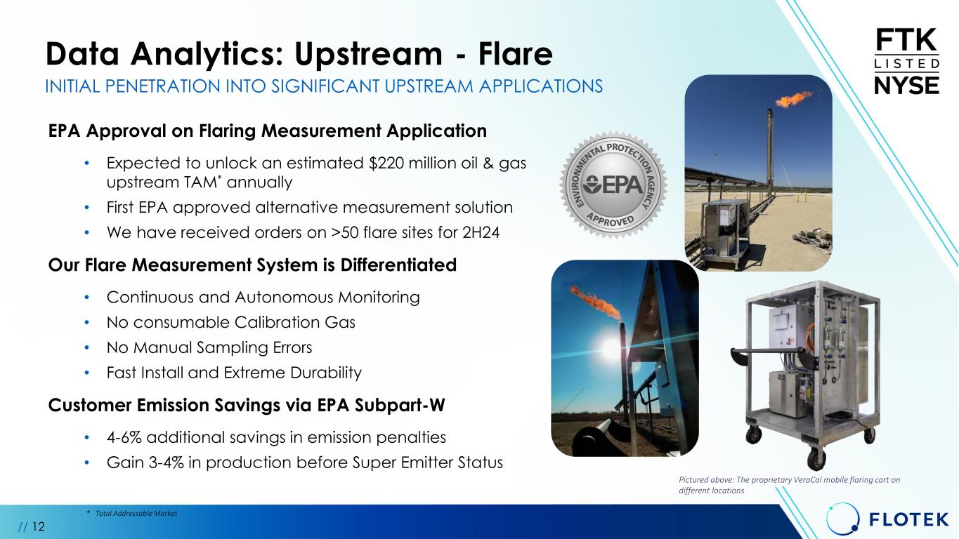 Data Analytics: “Measure More Strategy” Upstream • Flare monitoring: comply with EPA regulations • Custody Transfer: improves accuracy of payments to royalty owners and operators • Power Generation: facilitate field gas utilization in powering rigs and frac fleets Midstream • Gas processing plant control and optimization • Pipeline batch detection to optimize pipeline transmix processes • Vapor pressure controls to achieve product specifications • Emerging market in carbon capture Downstream • Process Controls: real-time measurement to optimize distillation tower efficiency • Chemicals: quality measurement in pipelines and terminals UTILIZING TECHNOLOGIES FOR EXPANSION INTO NEW MARKETS // 11
