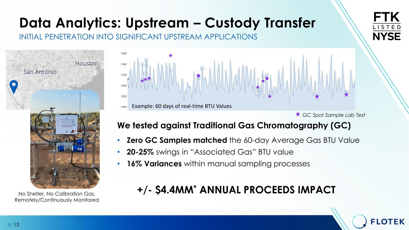 Data Analytics: Upstream - Flare // 12 EPA Approval on Flaring Measurement Application • Expected to unlock an estimated $220 million oil & gas upstream TAM* annually • First EPA approved alternative measurement solution • We have received orders on >50 flare sites for 2H24 Our Flare Measurement System is Differentiated • Continuous and Autonomous Monitoring • No consumable Calibration Gas • No Manual Sampling Errors • Fast Install and Extreme Durability Customer Emission Savings via EPA Subpart-W • 4-6% additional savings in emission penalties • Gain 3-4% in production before Super Emitter Status INITIAL PENETRATION INTO SIGNIFICANT UPSTREAM APPLICATIONS * Total Addressable Market Pictured above: The proprietary VeraCal mobile flaring cart on different locations