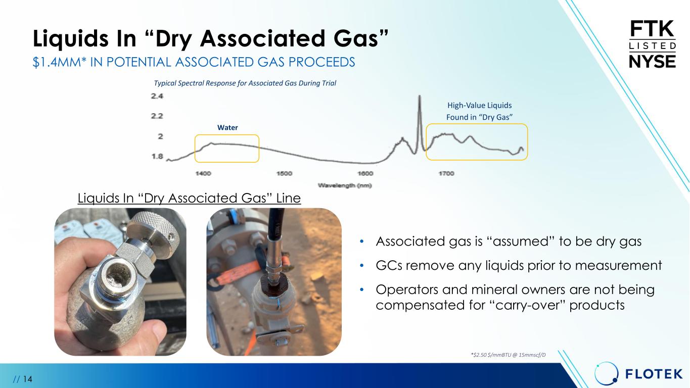 We tested against Traditional Gas Chromatography (GC) • Zero GC Samples matched the 60-day Average Gas BTU Value • 20-25% swings in “Associated Gas” BTU value • 16% Variances within manual sampling processes Data Analytics: Upstream – Custody Transfer // 13 INITIAL PENETRATION INTO SIGNIFICANT UPSTREAM APPLICATIONS No Shelter, No Calibration Gas, Remotely/Continuously Monitored San Antonio Houston Example: 60 days of real-time BTU Values GC Spot Sample Lab Test +/- $4.4MM* ANNUAL PROCEEDS IMPACT