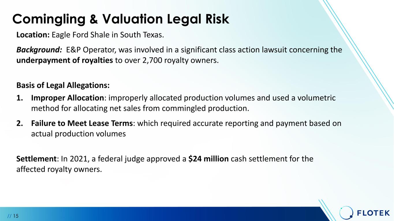 Comingling & Valuation Legal Risk Location: Eagle Ford Shale in South Texas. Background: E&P Operator, was involved in a significant class action lawsuit concerning the underpayment of royalties to over 2,700 royalty owners. Basis of Legal Allegations: 1. Improper Allocation: improperly allocated production volumes and used a volumetric method for allocating net sales from commingled production. 2. Failure to Meet Lease Terms: which required accurate reporting and payment based on actual production volumes Settlement: In 2021, a federal judge approved a $24 million cash settlement for the affected royalty owners. // 15