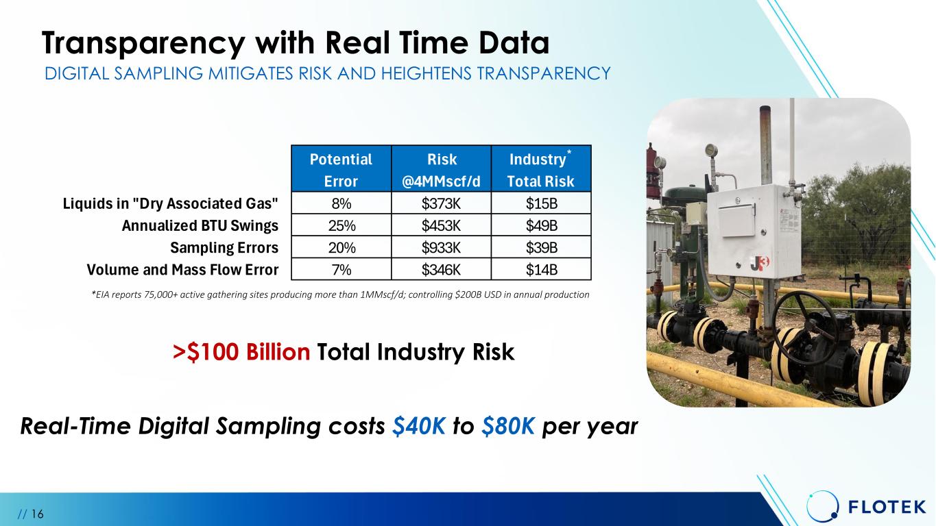 DIGITAL SAMPLING MITIGATES RISK AND HEIGHTENS TRANSPARENCY Real-Time Digital Sampling costs $40K to $80K per year >$100 Billion Total Industry Risk *EIA reports 75,000+ active gathering sites producing more than 1MMscf/d; controlling $200B USD in annual production // 16 Transparency with Real Time Data Potential Error Risk @4MMscf/d Industry* Total Risk Liquids in "Dry Associated Gas" 8% $373K $15B Annualized BTU Swings 25% $453K $49B Sampling Errors 20% $933K $39B Volume and Mass Flow Error 7% $346K $14B