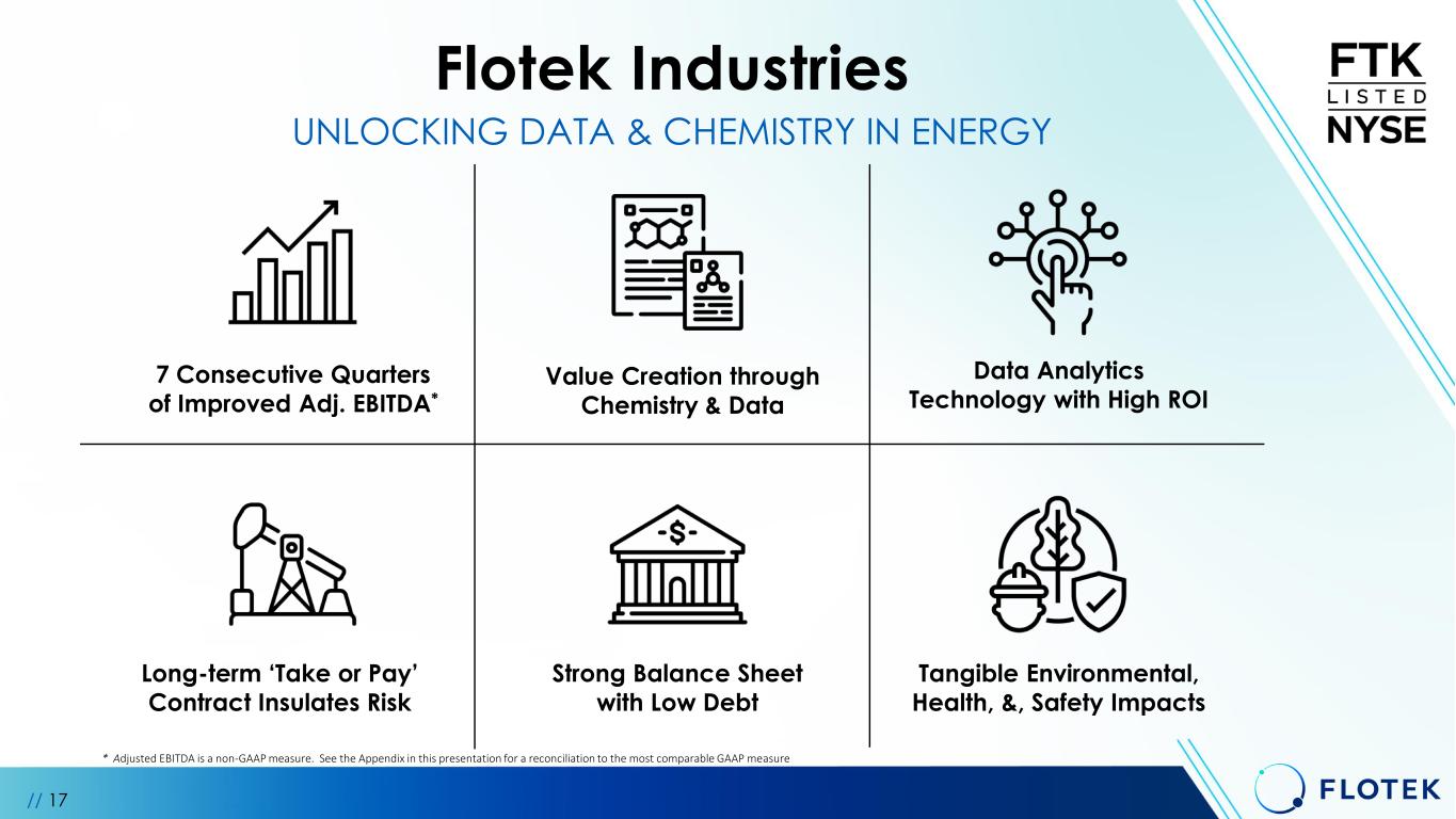 // 17 7 Consecutive Quarters of Improved Adj. EBITDA* Strong Balance Sheet with Low Debt Data Analytics Technology with High ROI Long-term ‘Take or Pay’ Contract Insulates Risk Tangible Environmental, Health, &, Safety Impacts Flotek Industries Value Creation through Chemistry & Data * Adjusted EBITDA is a non-GAAP measure. See the Appendix in this presentation for a reconciliation to the most comparable GAAP measure UNLOCKING DATA & CHEMISTRY IN ENERGY