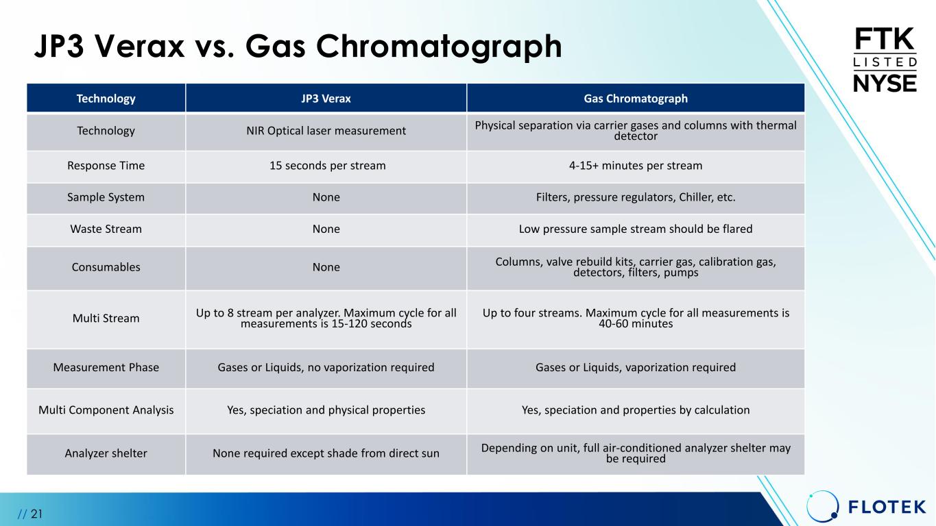 JP3 Verax vs. Gas Chromatograph Technology JP3 Verax Gas Chromatograph Technology NIR Optical laser measurement Physical separation via carrier gases and columns with thermal detector Response Time 15 seconds per stream 4-15+ minutes per stream Sample System None Filters, pressure regulators, Chiller, etc. Waste Stream None Low pressure sample stream should be flared Consumables None Columns, valve rebuild kits, carrier gas, calibration gas, detectors, filters, pumps Multi Stream Up to 8 stream per analyzer. Maximum cycle for all measurements is 15-120 seconds Up to four streams. Maximum cycle for all measurements is 40-60 minutes Measurement Phase Gases or Liquids, no vaporization required Gases or Liquids, vaporization required Multi Component Analysis Yes, speciation and physical properties Yes, speciation and properties by calculation Analyzer shelter None required except shade from direct sun Depending on unit, full air-conditioned analyzer shelter may be required // 21