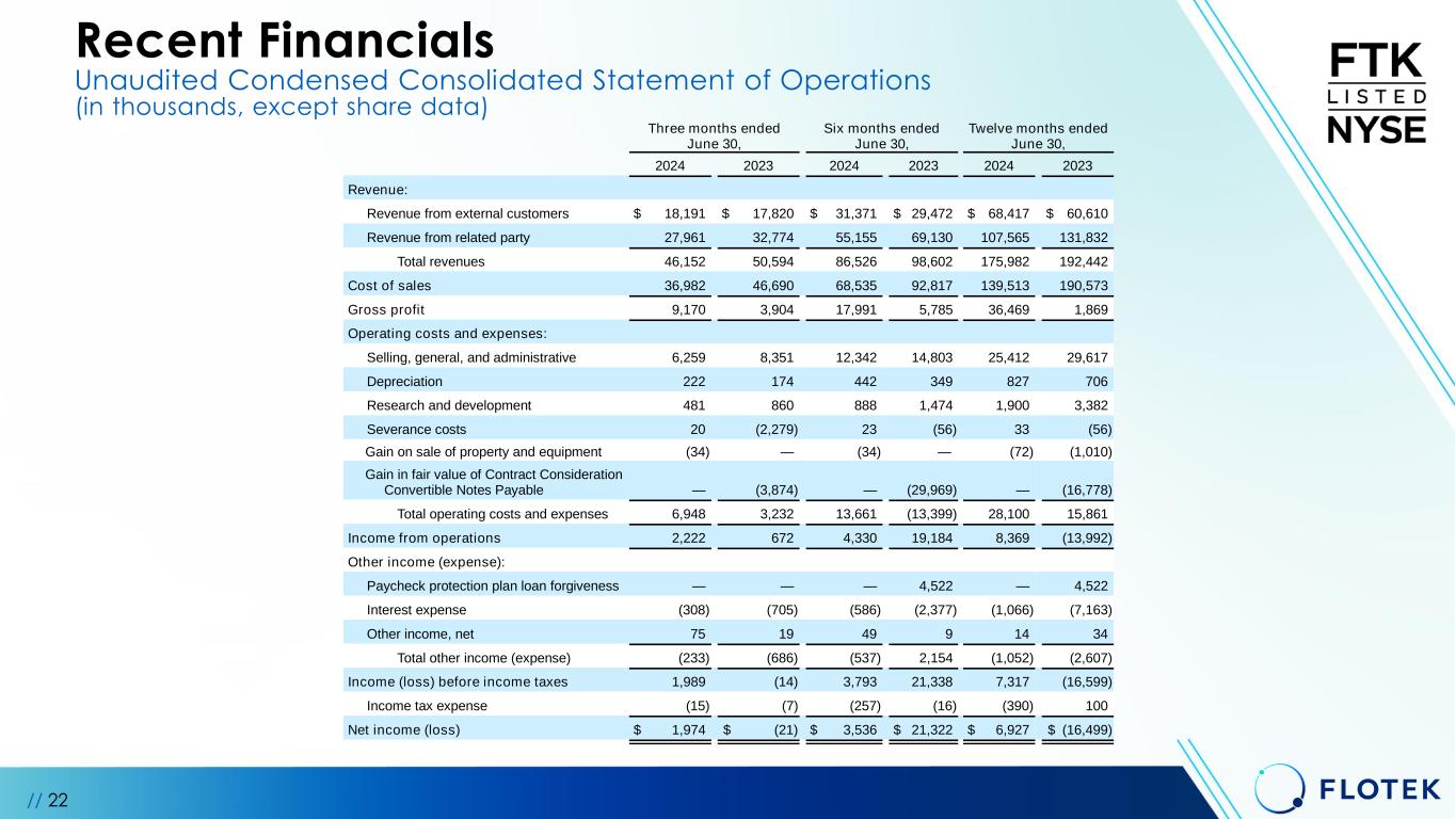 Recent Financials Unaudited Condensed Consolidated Statement of Operations (in thousands, except share data) // 22 Three months ended June 30, Six months ended June 30, Twelve months ended June 30, 2024 2023 2024 2023 2024 2023 Revenue: Revenue from external customers $ 18,191 $ 17,820 $ 31,371 $ 29,472 $ 68,417 $ 60,610 Revenue from related party 27,961 32,774 55,155 69,130 107,565 131,832 Total revenues 46,152 50,594 86,526 98,602 175,982 192,442 Cost of sales 36,982 46,690 68,535 92,817 139,513 190,573 Gross profit 9,170 3,904 17,991 5,785 36,469 1,869 Operating costs and expenses: Selling, general, and administrative 6,259 8,351 12,342 14,803 25,412 29,617 Depreciation 222 174 442 349 827 706 Research and development 481 860 888 1,474 1,900 3,382 Severance costs 20 (2,279) 23 (56) 33 (56) Gain on sale of property and equipment (34) — (34) — (72) (1,010) Gain in fair value of Contract Consideration Convertible Notes Payable — (3,874) — (29,969) — (16,778) Total operating costs and expenses 6,948 3,232 13,661 (13,399) 28,100 15,861 Income from operations 2,222 672 4,330 19,184 8,369 (13,992) Other income (expense): Paycheck protection plan loan forgiveness — — — 4,522 — 4,522 Interest expense (308) (705) (586) (2,377) (1,066) (7,163) Other income, net 75 19 49 9 14 34 Total other income (expense) (233) (686) (537) 2,154 (1,052) (2,607) Income (loss) before income taxes 1,989 (14) 3,793 21,338 7,317 (16,599) Income tax expense (15) (7) (257) (16) (390) 100 Net income (loss) $ 1,974 $ (21) $ 3,536 $ 21,322 $ 6,927 $ (16,499) Income (loss) per common share (As adjusted, see Note 14): Basic $ 0.07 $ — $ 0.12 $ 1.06 Diluted $ 0.06 $ (0.11) $ 0.12 $ (0.23) Weighted average common shares (As adjusted, see Note 14): Weighted average common shares used in computing basic income (loss) per common share 29,449 23,906 29,440 20,207 Weighted average common shares used in computing diluted income (loss) per common share 30,668 28,250 30,512 27,361