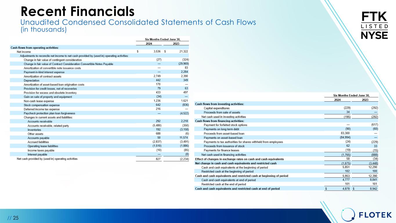 // 24 Recent Financials Unaudited Condensed Consolidated Balance Sheets (in thousands, except share data) June 30, 2024 December 31, 2023 ASSETS Current assets: Cash and cash equivalents $ 4,777 $ 5,851 Restricted cash 101 102 Accounts receivable, net of allowance for credit losses of $410 and $745 at June 30, 2024 and December 31, 2023, respectively 13,316 13,687 Accounts receivable, related party, net of allowance for credit losses of $0 at each June 30, 2024 and December 31, 2023, respectively 40,049 34,569 Inventories, net 12,142 12,838 Other current assets 2,834 3,564 Current contract asset 5,786 5,836 Total current assets 79,005 76,447 Long-term contract assets 66,121 68,820 Property and equipment, net 4,987 5,129 Operating lease right-of-use assets 4,184 5,030 Deferred tax assets, net 84 300 Other long-term assets 1,659 1,787 TOTAL ASSETS $ 156,040 $ 157,513 LIABILITIES AND STOCKHOLDERS’ EQUITY Current liabilities: Accounts payable $ 31,755 $ 31,705 Accrued liabilities 3,026 5,890 Income taxes payable 35 45 Current portion of operating lease liabilities 1,866 2,449 Current portion of finance lease liabilities 3 22 Asset-based loan 5,798 7,492 Current portion of long-term debt 149 179 Total current liabilities 42,632 47,782 Deferred revenue, long-term 35 35 Long-term operating lease liabilities 7,139 7,676 Long-term debt — 60 TOTAL LIABILITIES 49,806 55,553 Commitments and contingencies Stockholders’ equity: Preferred stock, $0.0001 par value, 100,000 shares authorized; no shares issued and outstanding — — Common stock, $0.0001 par value, 240,000,000 shares authorized; 30,866,597 shares issued and 29,759,154 shares outstanding at June 30, 2024; 30,772,837 shares issued and 29,664,130 shares outstanding at December 31, 2023 3 3 Additional paid-in capital 463,844 463,140 Accumulated other comprehensive income 185 127 Accumulated deficit (323,270) (326,806) Treasury stock, at cost; 1,107,442 and 1,108,707 shares at June 30, 2024 and December 31, 2023, respectively (34,528) (34,504) Total stockholders’ equity 106,234 101,960 TOTAL LIABILITIES AND STOCKHOLDERS’ EQUITY $ 156,040 $ 157,513