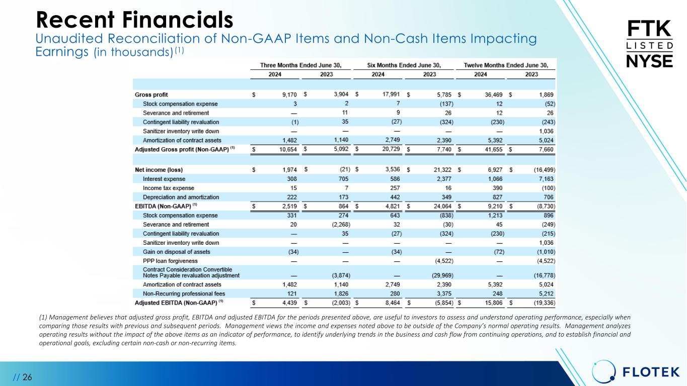// 26 (1) Management believes that adjusted gross profit, EBITDA and adjusted EBITDA for the periods presented above, are useful to investors to assess and understand operating performance, especially when comparing those results with previous and subsequent periods. Management views the income and expenses noted above to be outside of the Company’s normal operating results. Management analyzes operating results without the impact of the above items as an indicator of performance, to identify underlying trends in the business and cash flow from continuing operations, and to establish financial and operational goals, excluding certain non-cash or non-recurring items. Recent Financials Unaudited Reconciliation of Non-GAAP Items and Non-Cash Items Impacting Earnings (in thousands)(1)