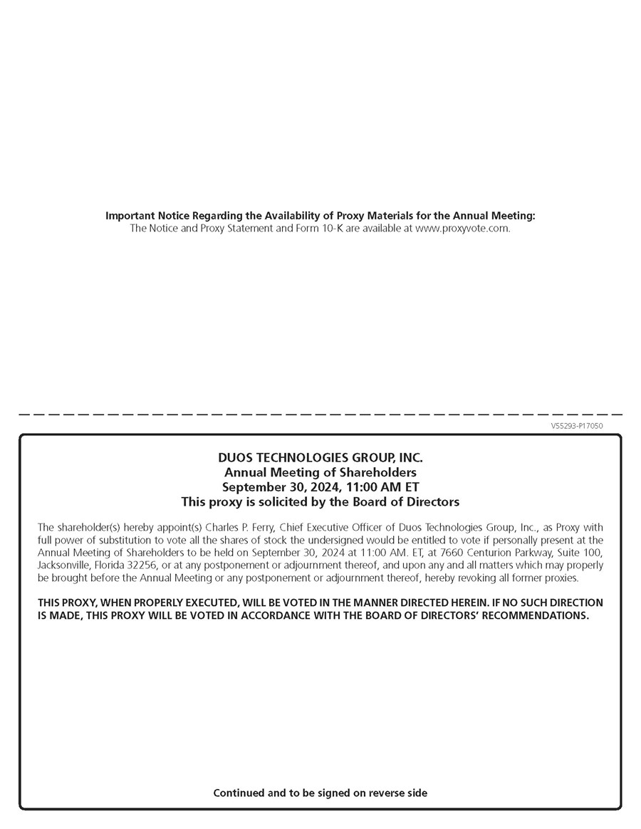 You are cordially invited to attend the Annual Meeting of Shareholders (the “Annual Meeting”) of Duos Technologies Group, Inc., a Florida corporation (together with its subsidiaries, the “Company”, “Duos”, “we”, “us” or “our”), which will be held on September 30, 2024, at 11:00 A.M., Eastern Time, in person at the Company's headquarters at 7660 Centurion Parkway, Suite 100, Jacksonville, Florida 32256 for the following purposes: