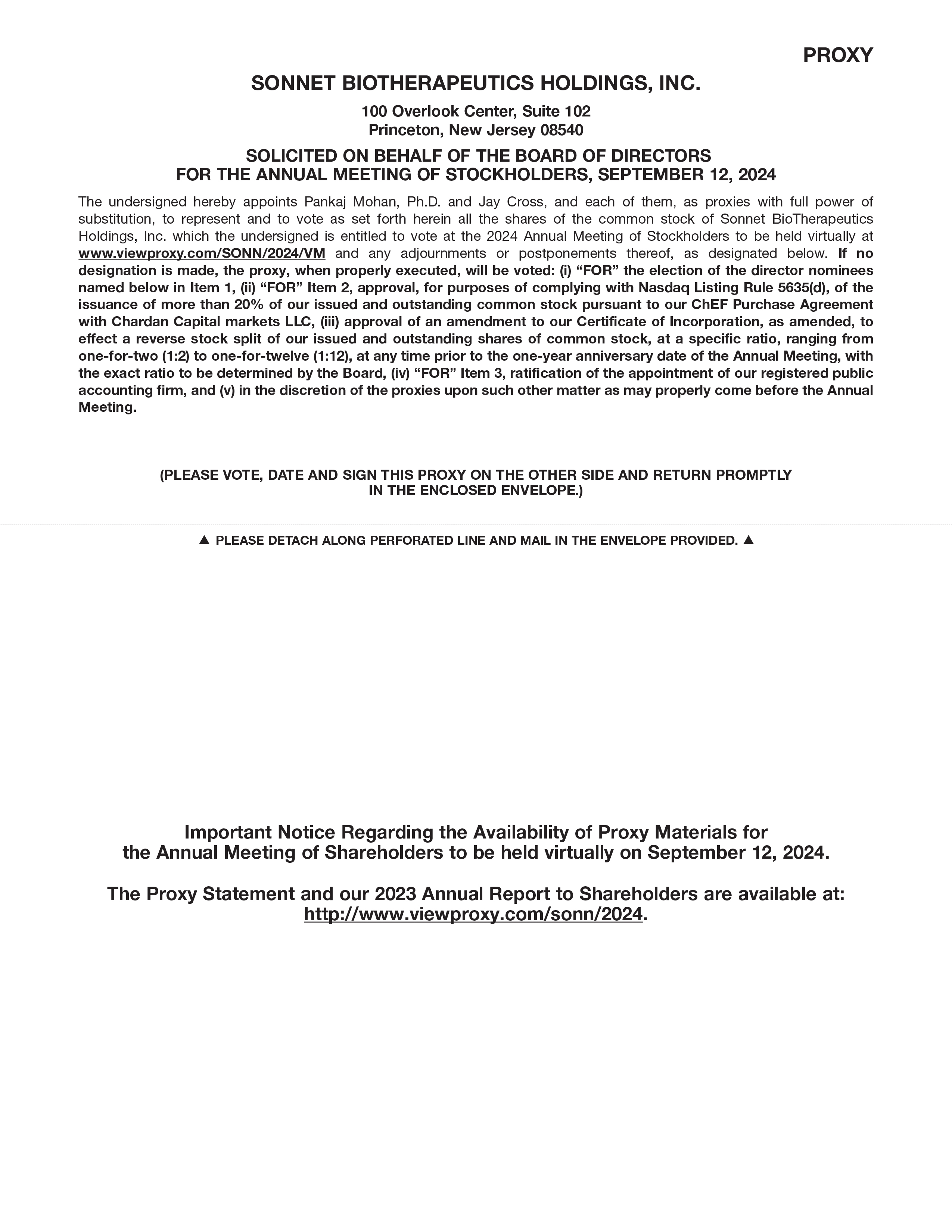 You are cordially invited to attend the Annual Meeting of Stockholders (the “Annual Meeting”) of Sonnet BioTherapeutics Holdings, Inc. (the “Company”) to be held on Thursday, September 12, 2024 at 9:00 a.m. Eastern Time. We are planning to hold the Annual Meeting virtually via the Internet at www.viewproxy.com/SONN/2024/VM. You will not be able to attend the Annual Meeting at a physical location.