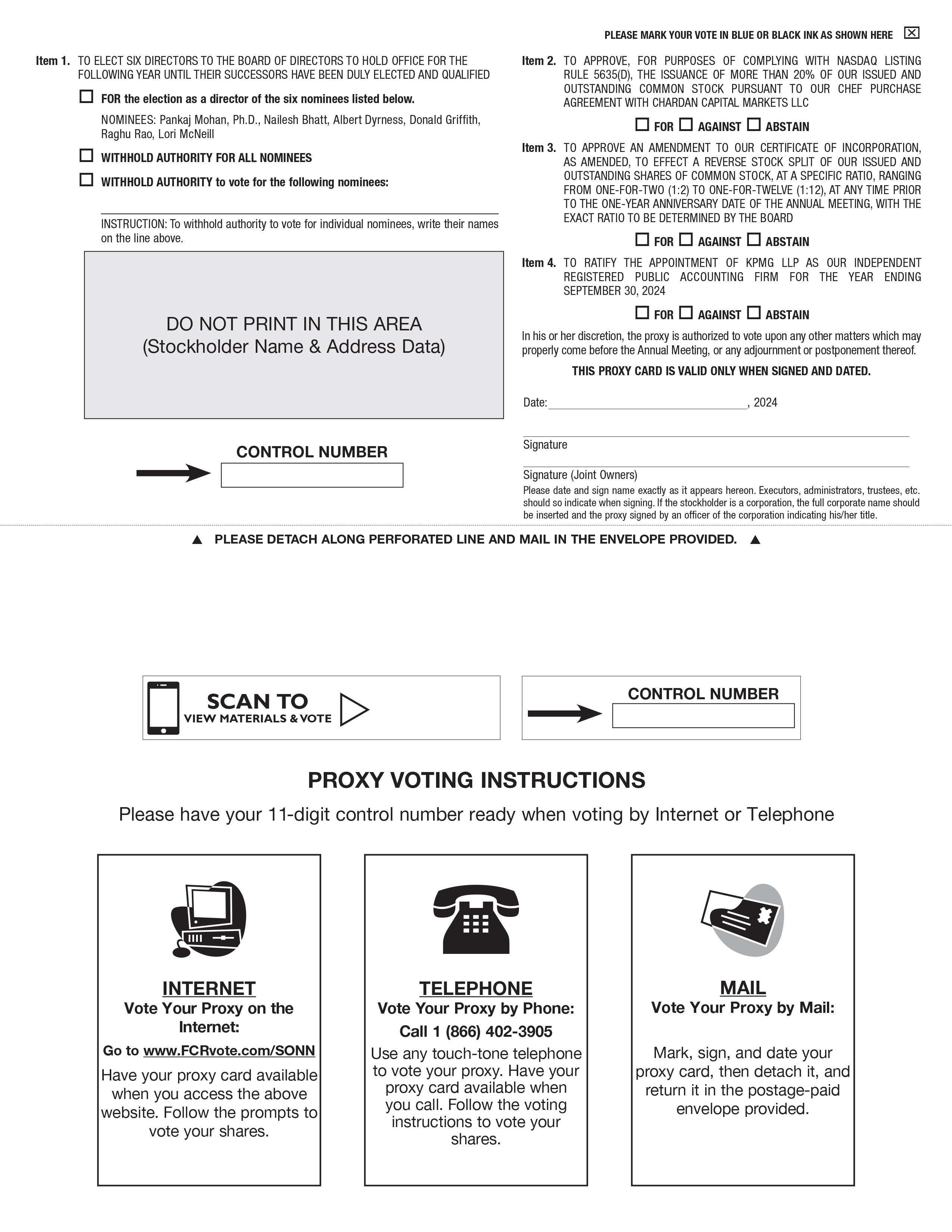 An online portal will be available to our stockholders at www.FCRvote.com/SONN commencing approximately on or about August 19, 2024. By accessing this portal, stockholders will be able to vote in advance of the Annual Meeting. Stockholders may also vote, and submit questions, during the Annual Meeting on www.viewproxy.com/SONN/2024/VM. To demonstrate proof of stock ownership, you will need to enter the control number received with your Notice, proxy card or voting instruction form to submit questions and vote at our Annual Meeting. If you hold your shares in “street name” (that is, through a broker or other nominee), you will need authorization from your broker or nominee in order to vote. We intend to answer questions submitted during the meeting that are pertinent to the Company and the items being brought for stockholder vote at the Annual Meeting, as time permits, and in accordance with the Rules of Conduct for the Annual Meeting. To promote fairness, efficiently use our resources and ensure all stockholder questions are able to be addressed, we will respond to no more than two questions from a single stockholder. We have retained Alliance Advisors, LLC to host our virtual Annual Meeting and to distribute, receive, count and tabulate proxies.