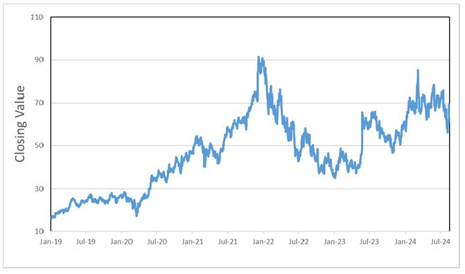 The following graph sets forth the historical performance of the common stock of Marvell Technology, Inc. based on the daily historical closing values from January 1, 2019 through August 16, 2024. We obtained the closing values below from Bloomberg. We have not undertaken any independent review of, or made any due diligence inquiry with respect to, the information obtained from Bloomberg.
