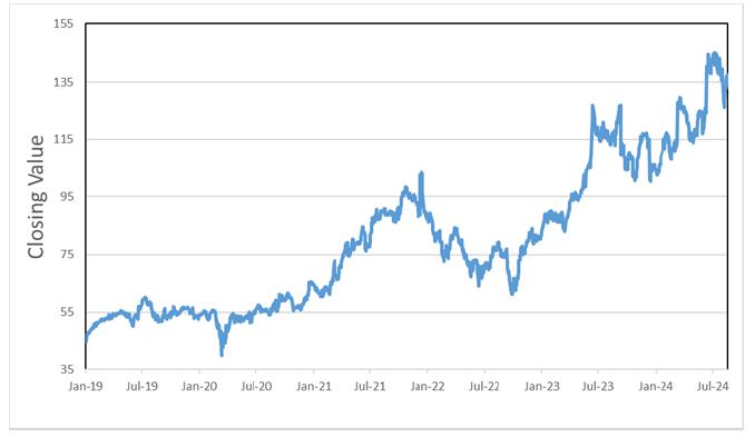 The following graph sets forth the historical performance of the common stock of Oracle Corporation based on the daily historical closing values from January 1, 2019 through August 16, 2024. We obtained the closing values below from Bloomberg. We have not undertaken any independent review of, or made any due diligence inquiry with respect to, the information obtained from Bloomberg.
