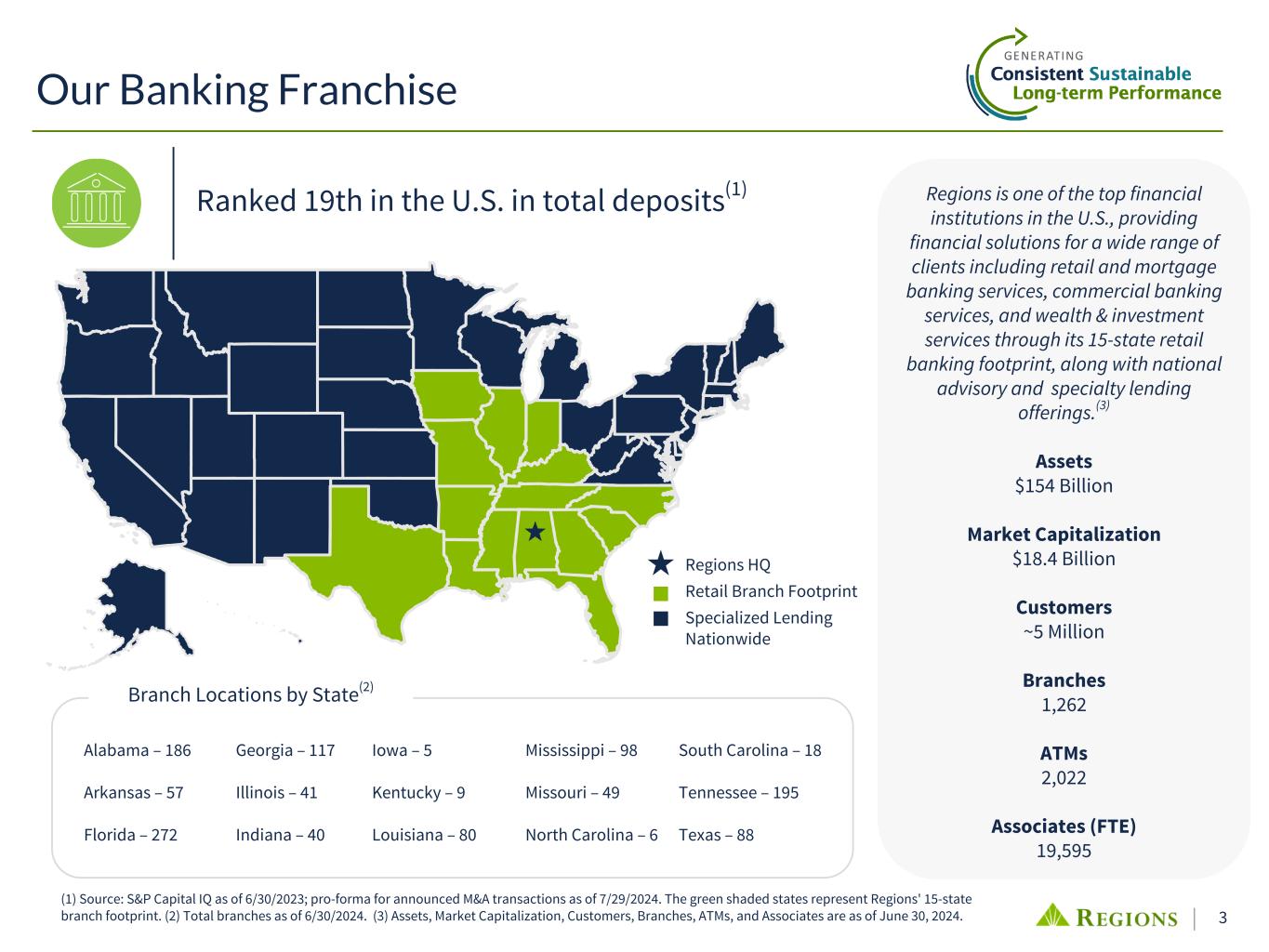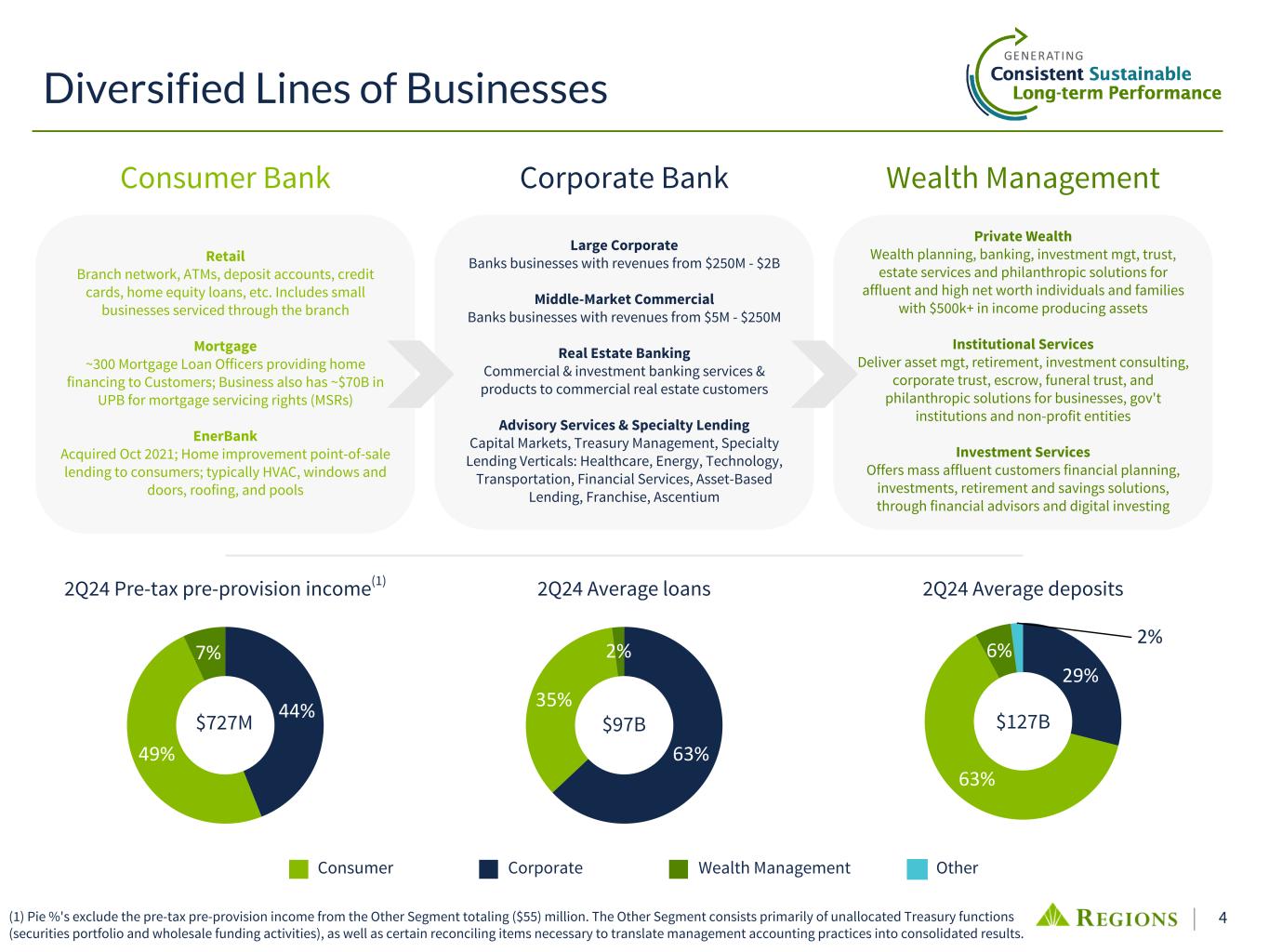 3 Alabama – 186 Georgia – 117 Iowa – 5 Mississippi – 98 South Carolina – 18 Arkansas – 57 Illinois – 41 Kentucky – 9 Missouri – 49 Tennessee – 195 Florida – 272 Indiana – 40 Louisiana – 80 North Carolina – 6 Texas – 88 Ranked 19th in the U.S. in total deposits(1) Branch Locations by State(2) Our Banking Franchise (1) Source: S&P Capital IQ as of 6/30/2023; pro-forma for announced M&A transactions as of 7/29/2024. The green shaded states represent Regions' 15-state branch footprint. (2) Total branches as of 6/30/2024. (3) Assets, Market Capitalization, Customers, Branches, ATMs, and Associates are as of June 30, 2024. Regions HQ Retail Branch Footprint Specialized Lending Nationwide Regions is one of the top financial institutions in the U.S., providing financial solutions for a wide range of clients including retail and mortgage banking services, commercial banking services, and wealth & investment services through its 15-state retail banking footprint, along with national advisory and specialty lending offerings.(3) Assets $154 Billion Market Capitalization $18.4 Billion Customers ~5 Million Branches 1,262 ATMs 2,022 Associates (FTE) 19,595