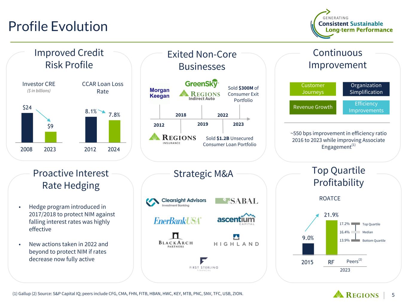 4 Diversified Lines of Businesses Retail Branch network, ATMs, deposit accounts, credit cards, home equity loans, etc. Includes small businesses serviced through the branch Mortgage ~300 Mortgage Loan Officers providing home financing to Customers; Business also has ~$70B in UPB for mortgage servicing rights (MSRs) EnerBank Acquired Oct 2021; Home improvement point-of-sale lending to consumers; typically HVAC, windows and doors, roofing, and pools Large Corporate Banks businesses with revenues from $250M - $2B Middle-Market Commercial Banks businesses with revenues from $5M - $250M Real Estate Banking Commercial & investment banking services & products to commercial real estate customers Advisory Services & Specialty Lending Capital Markets, Treasury Management, Specialty Lending Verticals: Healthcare, Energy, Technology, Transportation, Financial Services, Asset-Based Lending, Franchise, Ascentium Private Wealth Wealth planning, banking, investment mgt, trust, estate services and philanthropic solutions for affluent and high net worth individuals and families with $500k+ in income producing assets Institutional Services Deliver asset mgt, retirement, investment consulting, corporate trust, escrow, funeral trust, and philanthropic solutions for businesses, gov't institutions and non-profit entities Investment Services Offers mass affluent customers financial planning, investments, retirement and savings solutions, through financial advisors and digital investing Consumer Bank Corporate Bank Wealth Management (1) Pie %'s exclude the pre-tax pre-provision income from the Other Segment totaling ($55) million. The Other Segment consists primarily of unallocated Treasury functions (securities portfolio and wholesale funding activities), as well as certain reconciling items necessary to translate management accounting practices into consolidated results. 44% 49% 7% 63% 35% 2% 29% 63% 6% 2% $727M $97B $127B Consumer Corporate Wealth Management Other 2Q24 Pre-tax pre-provision income(1) 2Q24 Average deposits2Q24 Average loans