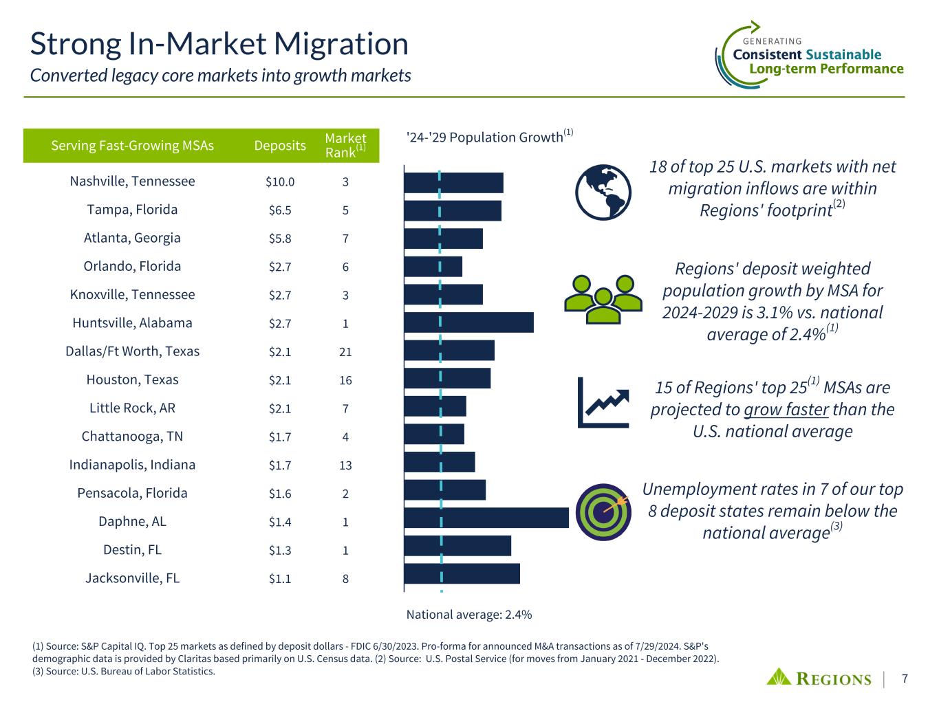 6 Top Market Share Plays valuable role in the competitive landscape (1) Based on MSA and non-MSA counties using FDIC deposit data as of 6/30/2023; pro-forma for announced M&A transactions as of 7/29/2024. (2) Significant money center bank presence (JPM, BAC, C, WFC) defined as combined market share using 6/30/2023 FDIC deposit data of 20% or more. Markets with top 5 market share(1) • Ranked 19th in the U.S. in total deposits(1) • 86% of deposits in 7 states: Alabama, Tennessee, Florida, Louisiana, Mississippi, Georgia, Arkansas • Top 5 or better market share in ~70% of MSAs across 15-state footprint(1) • Greater than 2/3 of deposits in markets without a significant money center bank presence(2) • High growth markets benefiting from population and business growth: ◦ Florida ◦ Georgia ◦ Texas ◦ Tennessee MSAs Non-MSA Counties
