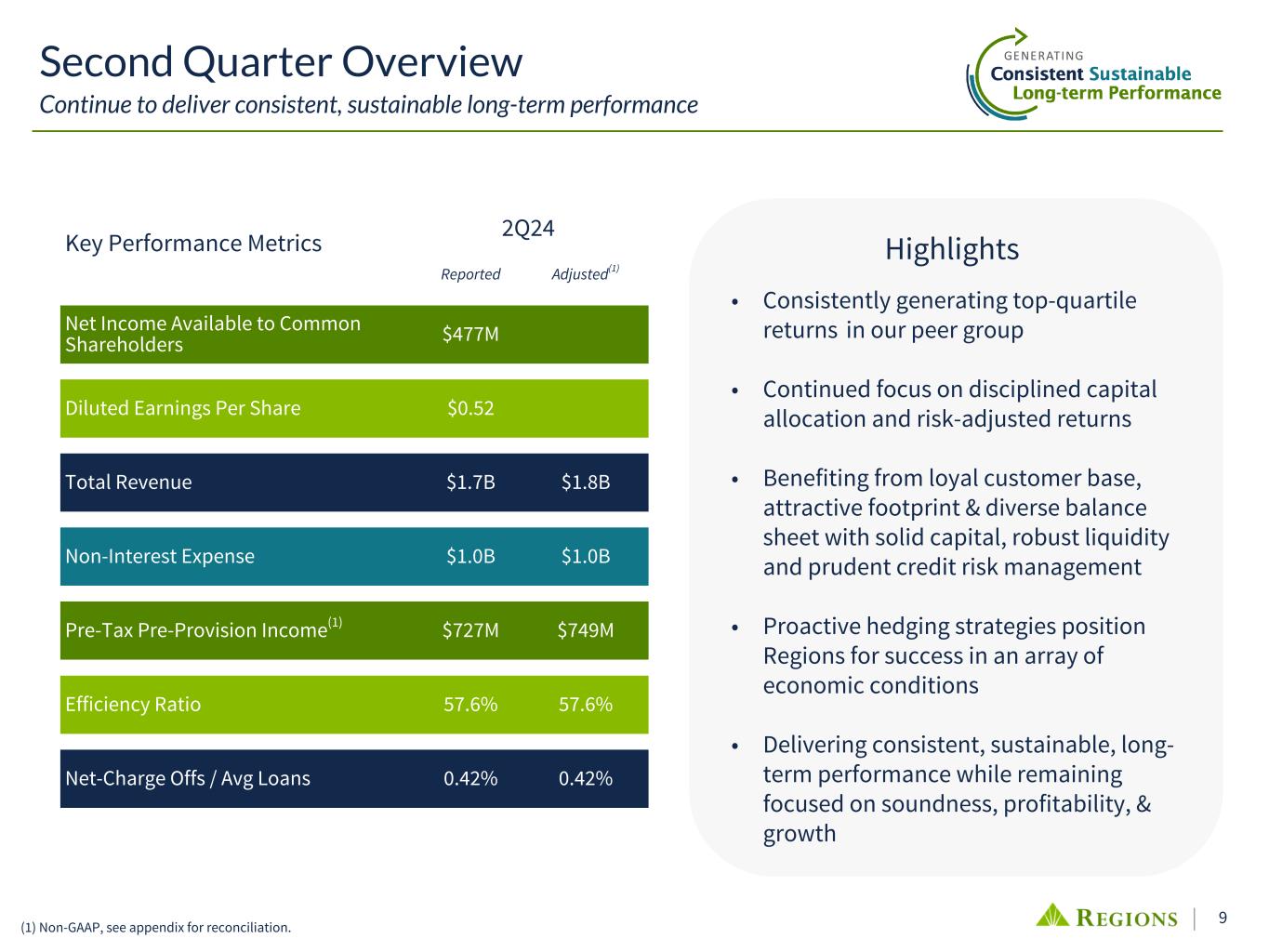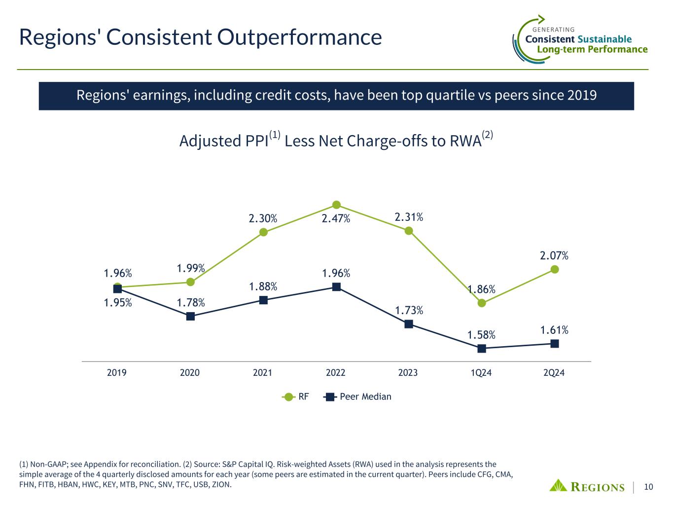 9 Second Quarter Overview Continue to deliver consistent, sustainable long-term performance (1) Non-GAAP, see appendix for reconciliation. Key Performance Metrics 2Q24 Reported Adjusted(1) Net Income Available to Common Shareholders $477M Diluted Earnings Per Share $0.52 Total Revenue $1.7B $1.8B Non-Interest Expense $1.0B $1.0B Pre-Tax Pre-Provision Income(1) $727M $749M Efficiency Ratio 57.6% 57.6% Net-Charge Offs / Avg Loans 0.42% 0.42% • Consistently generating top-quartile returns in our peer group • Continued focus on disciplined capital allocation and risk-adjusted returns • Benefiting from loyal customer base, attractive footprint & diverse balance sheet with solid capital, robust liquidity and prudent credit risk management • Proactive hedging strategies position Regions for success in an array of economic conditions • Delivering consistent, sustainable, long- term performance while remaining focused on soundness, profitability, & growth Highlights