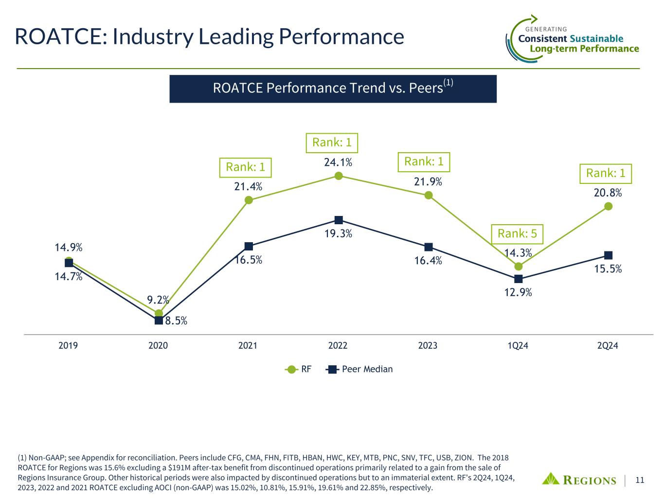 10 Regions' Consistent Outperformance Adjusted PPI(1) Less Net Charge-offs to RWA(2) Regions' earnings, including credit costs, have been top quartile vs peers since 2019 1.96% 1.99% 2.30% 2.47% 2.31% 1.86% 2.07% 1.95% 1.78% 1.88% 1.96% 1.73% 1.58% 1.61% RF Peer Median 2019 2020 2021 2022 2023 1Q24 2Q24 (1) Non-GAAP; see Appendix for reconciliation. (2) Source: S&P Capital IQ. Risk-weighted Assets (RWA) used in the analysis represents the simple average of the 4 quarterly disclosed amounts for each year (some peers are estimated in the current quarter). Peers include CFG, CMA, FHN, FITB, HBAN, HWC, KEY, MTB, PNC, SNV, TFC, USB, ZION.