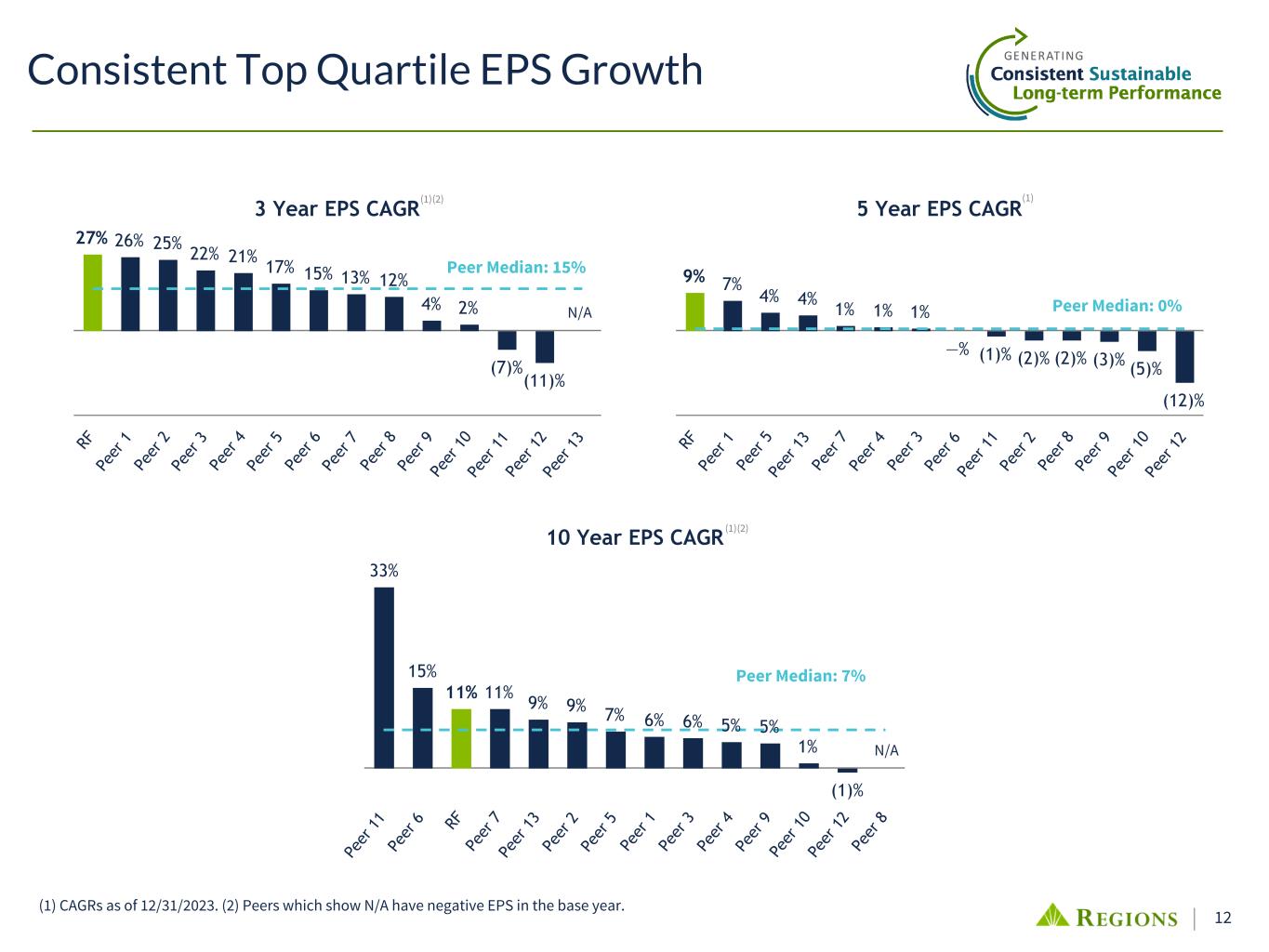 11 ROATCE: Industry Leading Performance 14.9% 9.2% 21.4% 24.1% 21.9% 14.3% 20.8% 14.7% 8.5% 16.5% 19.3% 16.4% 12.9% 15.5% RF Peer Median 2019 2020 2021 2022 2023 1Q24 2Q24 ROATCE Performance Trend vs. Peers(1) (1) Non-GAAP; see Appendix for reconciliation. Peers include CFG, CMA, FHN, FITB, HBAN, HWC, KEY, MTB, PNC, SNV, TFC, USB, ZION. The 2018 ROATCE for Regions was 15.6% excluding a $191M after-tax benefit from discontinued operations primarily related to a gain from the sale of Regions Insurance Group. Other historical periods were also impacted by discontinued operations but to an immaterial extent. RF's 2Q24, 1Q24, 2023, 2022 and 2021 ROATCE excluding AOCI (non-GAAP) was 15.02%, 10.81%, 15.91%, 19.61% and 22.85%, respectively. Rank: 1 Rank: 1 Rank: 1 Rank: 5 Rank: 1