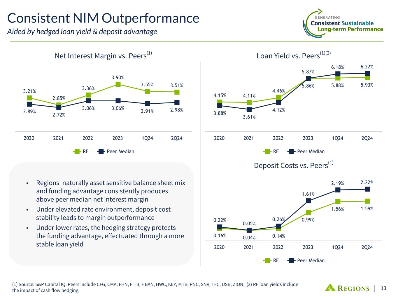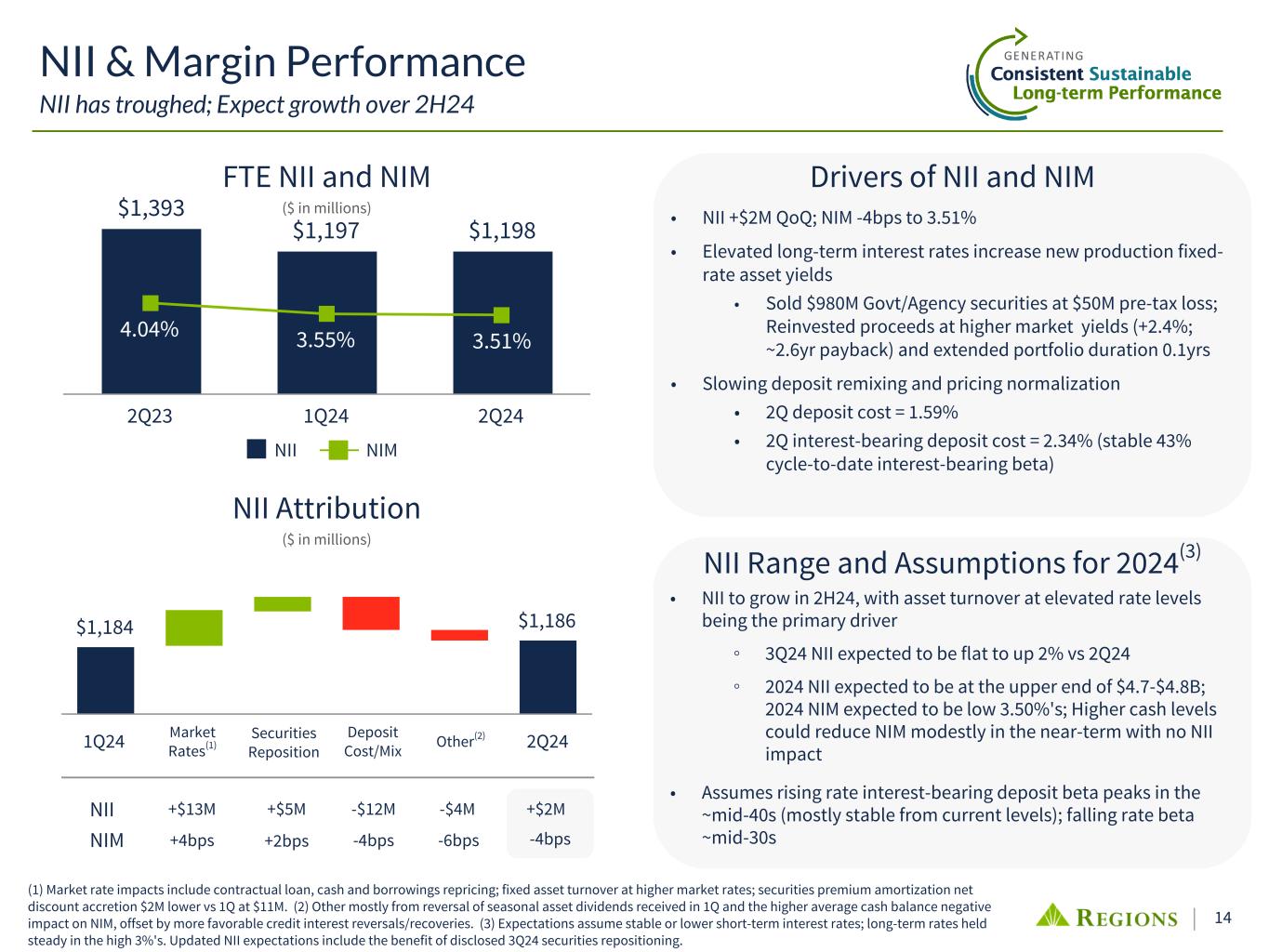 13 • Regions' naturally asset sensitive balance sheet mix and funding advantage consistently produces above peer median net interest margin • Under elevated rate environment, deposit cost stability leads to margin outperformance • Under lower rates, the hedging strategy protects the funding advantage, effectuated through a more stable loan yield 4.15% 4.11% 4.46% 5.86% 5.88% 5.93% 3.88% 3.61% 4.12% 5.87% 6.18% 6.22% RF Peer Median 2020 2021 2022 2023 1Q24 2Q24 Consistent NIM Outperformance Aided by hedged loan yield & deposit advantage (1) Source: S&P Capital IQ. Peers include CFG, CMA, FHN, FITB, HBAN, HWC, KEY, MTB, PNC, SNV, TFC, USB, ZION. (2) RF loan yields include the impact of cash flow hedging. Net Interest Margin vs. Peers(1) 3.21% 2.85% 3.36% 3.90% 3.55% 3.51% 2.89% 2.72% 3.06% 3.06% 2.91% 2.98% RF Peer Median 2020 2021 2022 2023 1Q24 2Q24 Loan Yield vs. Peers(1)(2) 0.16% 0.04% 0.14% 0.99% 1.56% 1.59% 0.22% 0.05% 0.26% 1.61% 2.19% 2.22% RF Peer Median 2020 2021 2022 2023 1Q24 2Q24 Deposit Costs vs. Peers(1)