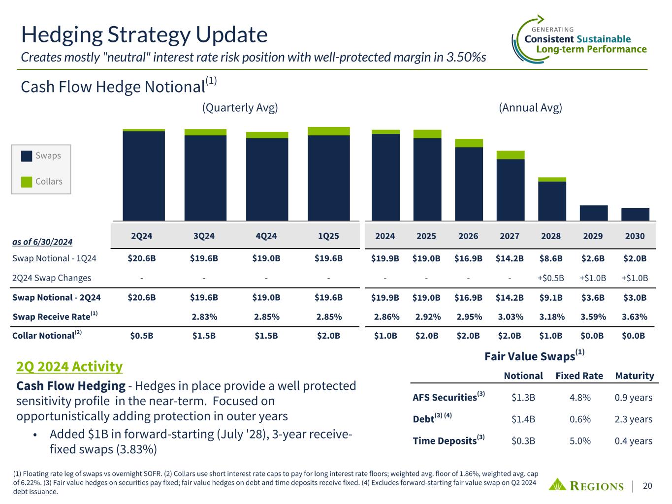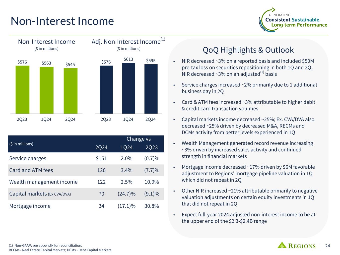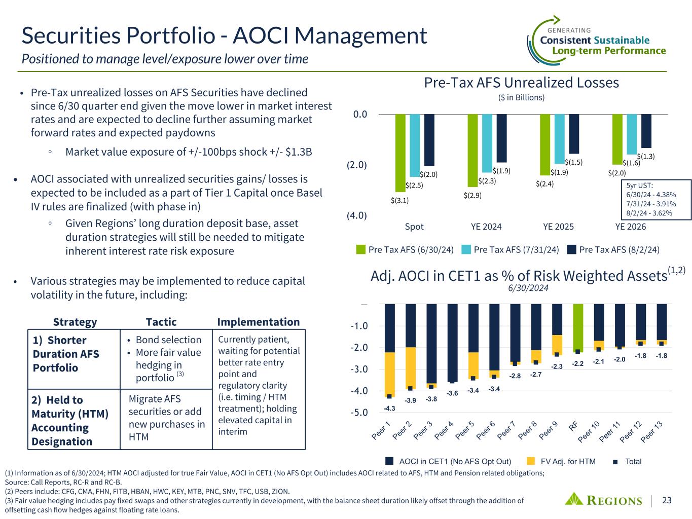23 2) Held to Maturity (HTM) Accounting Designation (1) Information as of 6/30/2024; HTM AOCI adjusted for true Fair Value, AOCI in CET1 (No AFS Opt Out) includes AOCI related to AFS, HTM and Pension related obligations; Source: Call Reports, RC-R and RC-B. (2) Peers include: CFG, CMA, FHN, FITB, HBAN, HWC, KEY, MTB, PNC, SNV, TFC, USB, ZION. (3) Fair value hedging includes pay fixed swaps and other strategies currently in development, with the balance sheet duration likely offset through the addition of offsetting cash flow hedges against floating rate loans. Securities Portfolio - AOCI Management Positioned to manage level/exposure lower over time Pre-Tax AFS Unrealized Losses ($ in Billions) $(3.1) $(2.9) $(2.4) $(2.0) $(2.5) $(2.3) $(1.9) $(1.6) $(2.0) $(1.9) $(1.5) $(1.3) Pre Tax AFS (6/30/24) Pre Tax AFS (7/31/24) Pre Tax AFS (8/2/24) Spot YE 2024 YE 2025 YE 2026 (4.0) (2.0) 0.0 -4.3 -3.9 -3.8 -3.6 -3.4 -3.4 -2.8 -2.7 -2.3 -2.2 -2.1 -2.0 -1.8 -1.8 AOCI in CET1 (No AFS Opt Out) FV Adj. for HTM Total Pee r 1 Pee r 2 Pee r 3 Pee r 4 Pee r 5 Pee r 6 Pee r 7 Pee r 8 Pee r 9 RF Pee r 1 0 Pee r 1 1 Pee r 1 2 Pee r 1 3 -5.0 -4.0 -3.0 -2.0 -1.0 — Adj. AOCI in CET1 as % of Risk Weighted Assets(1,2) 6/30/2024 1) Shorter Duration AFS Portfolio • Bond selection • More fair value hedging in portfolio (3) Migrate AFS securities or add new purchases in HTM Currently patient, waiting for potential better rate entry point and regulatory clarity (i.e. timing / HTM treatment); holding elevated capital in interim 5yr UST: 6/30/24 - 4.38% 7/31/24 - 3.91% 8/2/24 - 3.62% • Pre-Tax unrealized losses on AFS Securities have declined since 6/30 quarter end given the move lower in market interest rates and are expected to decline further assuming market forward rates and expected paydowns ◦ Market value exposure of +/-100bps shock +/- $1.3B • AOCI associated with unrealized securities gains/ losses is expected to be included as a part of Tier 1 Capital once Basel IV rules are finalized (with phase in) ◦ Given Regions’ long duration deposit base, asset duration strategies will still be needed to mitigate inherent interest rate risk exposure • Various strategies may be implemented to reduce capital volatility in the future, including: Strategy Tactic Implementation
