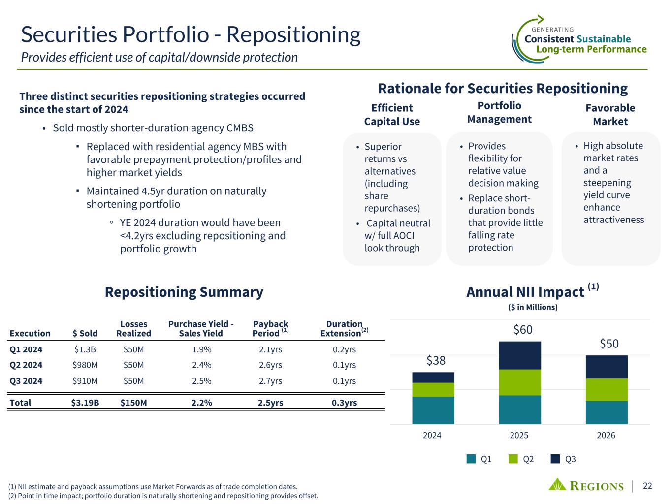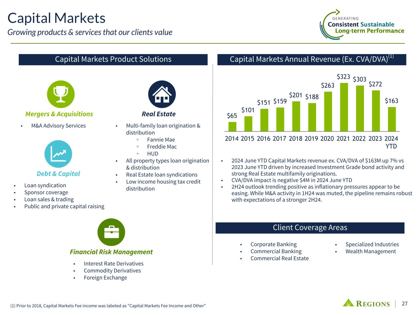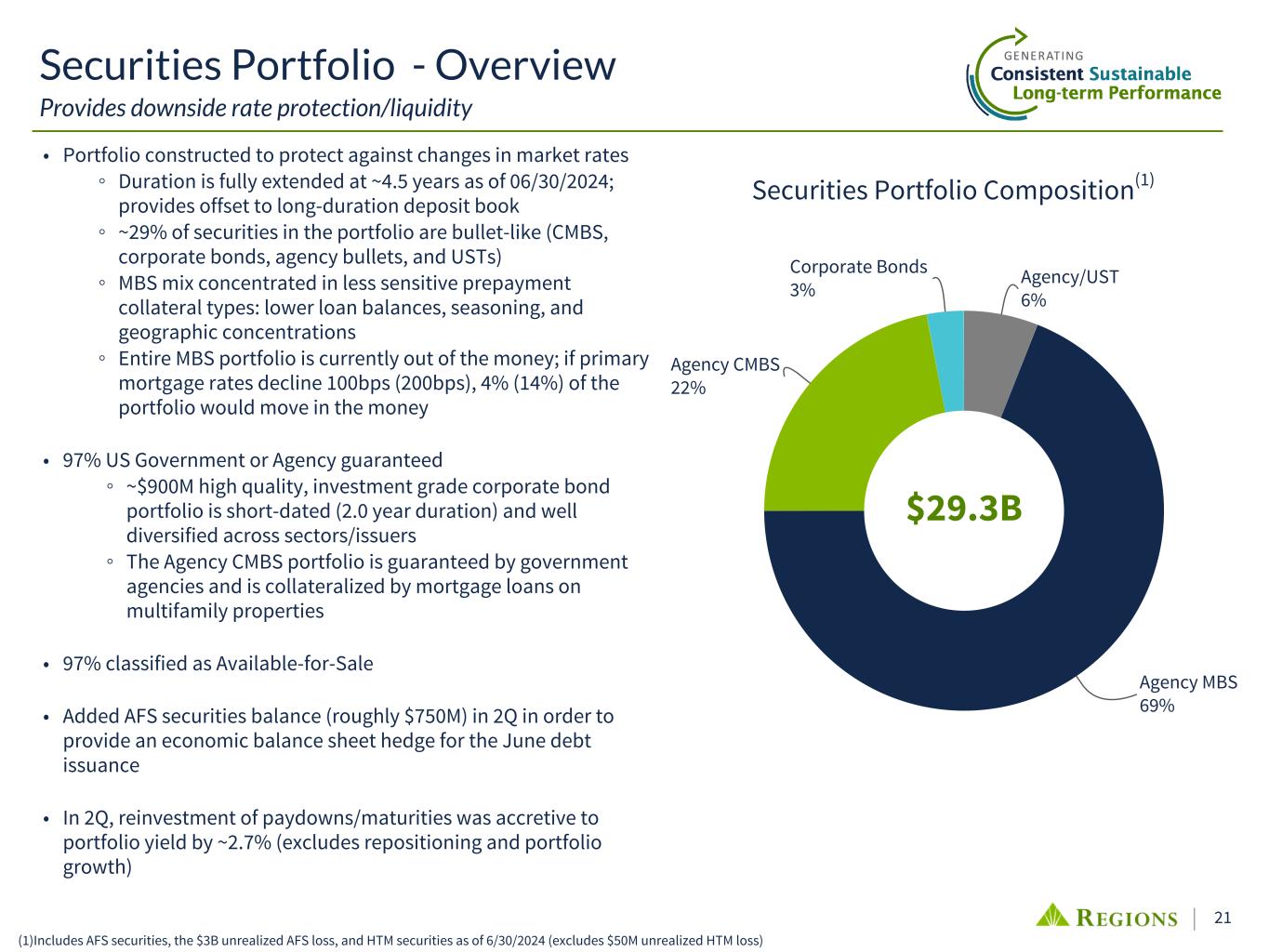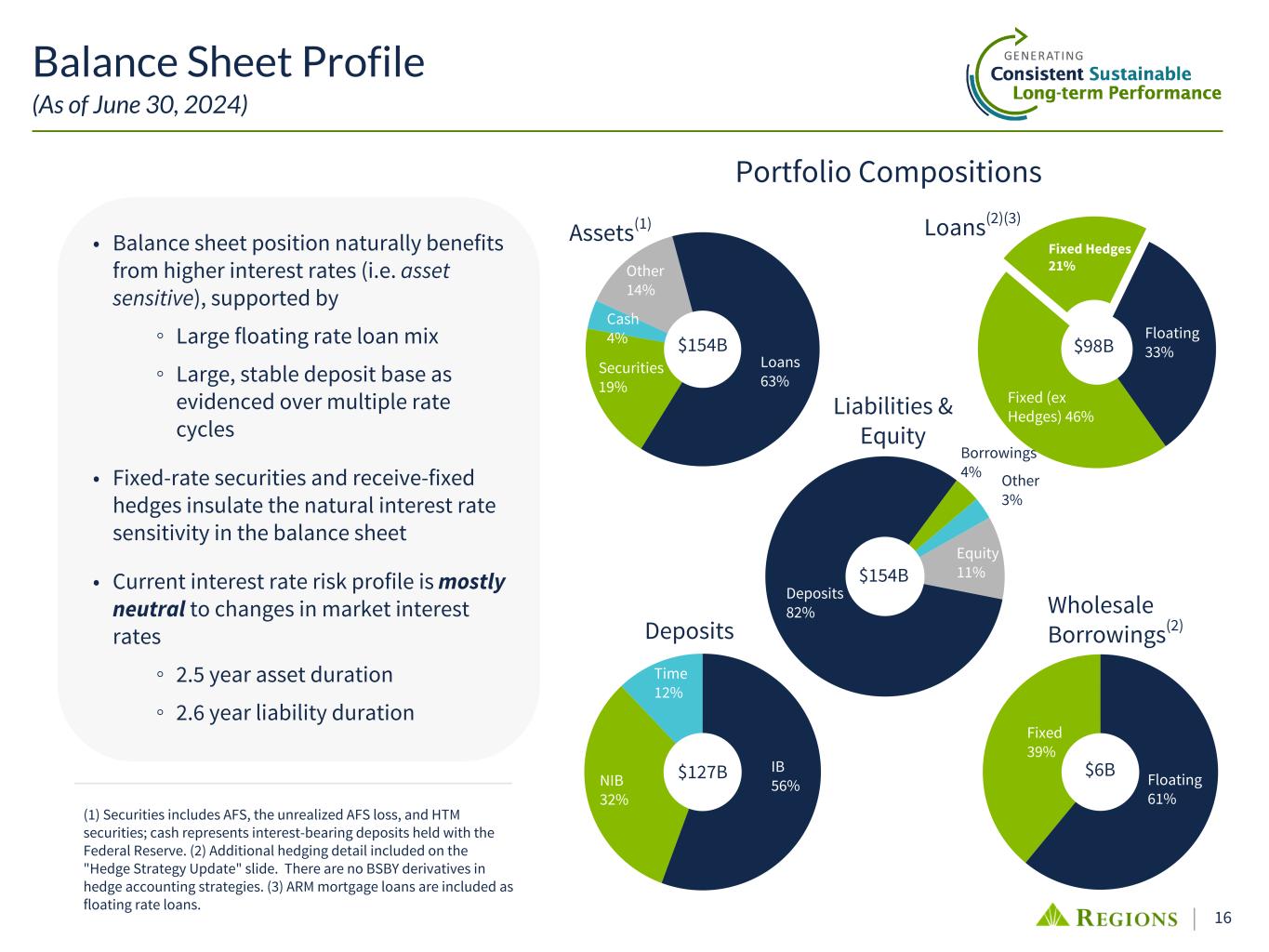 23 2) Held to Maturity (HTM) Accounting Designation (1) Information as of 6/30/2024; HTM AOCI adjusted for true Fair Value, AOCI in CET1 (No AFS Opt Out) includes AOCI related to AFS, HTM and Pension related obligations; Source: Call Reports, RC-R and RC-B. (2) Peers include: CFG, CMA, FHN, FITB, HBAN, HWC, KEY, MTB, PNC, SNV, TFC, USB, ZION. (3) Fair value hedging includes pay fixed swaps and other strategies currently in development, with the balance sheet duration likely offset through the addition of offsetting cash flow hedges against floating rate loans. Securities Portfolio - AOCI Management Positioned to manage level/exposure lower over time Pre-Tax AFS Unrealized Losses ($ in Billions) $(3.1) $(2.9) $(2.4) $(2.0) $(2.5) $(2.3) $(1.9) $(1.6) $(2.0) $(1.9) $(1.5) $(1.3) Pre Tax AFS (6/30/24) Pre Tax AFS (7/31/24) Pre Tax AFS (8/2/24) Spot YE 2024 YE 2025 YE 2026 (4.0) (2.0) 0.0 -4.3 -3.9 -3.8 -3.6 -3.4 -3.4 -2.8 -2.7 -2.3 -2.2 -2.1 -2.0 -1.8 -1.8 AOCI in CET1 (No AFS Opt Out) FV Adj. for HTM Total Pee r 1 Pee r 2 Pee r 3 Pee r 4 Pee r 5 Pee r 6 Pee r 7 Pee r 8 Pee r 9 RF Pee r 1 0 Pee r 1 1 Pee r 1 2 Pee r 1 3 -5.0 -4.0 -3.0 -2.0 -1.0 — Adj. AOCI in CET1 as % of Risk Weighted Assets(1,2) 6/30/2024 1) Shorter Duration AFS Portfolio • Bond selection • More fair value hedging in portfolio (3) Migrate AFS securities or add new purchases in HTM Currently patient, waiting for potential better rate entry point and regulatory clarity (i.e. timing / HTM treatment); holding elevated capital in interim 5yr UST: 6/30/24 - 4.38% 7/31/24 - 3.91% 8/2/24 - 3.62% • Pre-Tax unrealized losses on AFS Securities have declined since 6/30 quarter end given the move lower in market interest rates and are expected to decline further assuming market forward rates and expected paydowns ◦ Market value exposure of +/-100bps shock +/- $1.3B • AOCI associated with unrealized securities gains/ losses is expected to be included as a part of Tier 1 Capital once Basel IV rules are finalized (with phase in) ◦ Given Regions’ long duration deposit base, asset duration strategies will still be needed to mitigate inherent interest rate risk exposure • Various strategies may be implemented to reduce capital volatility in the future, including: Strategy Tactic Implementation