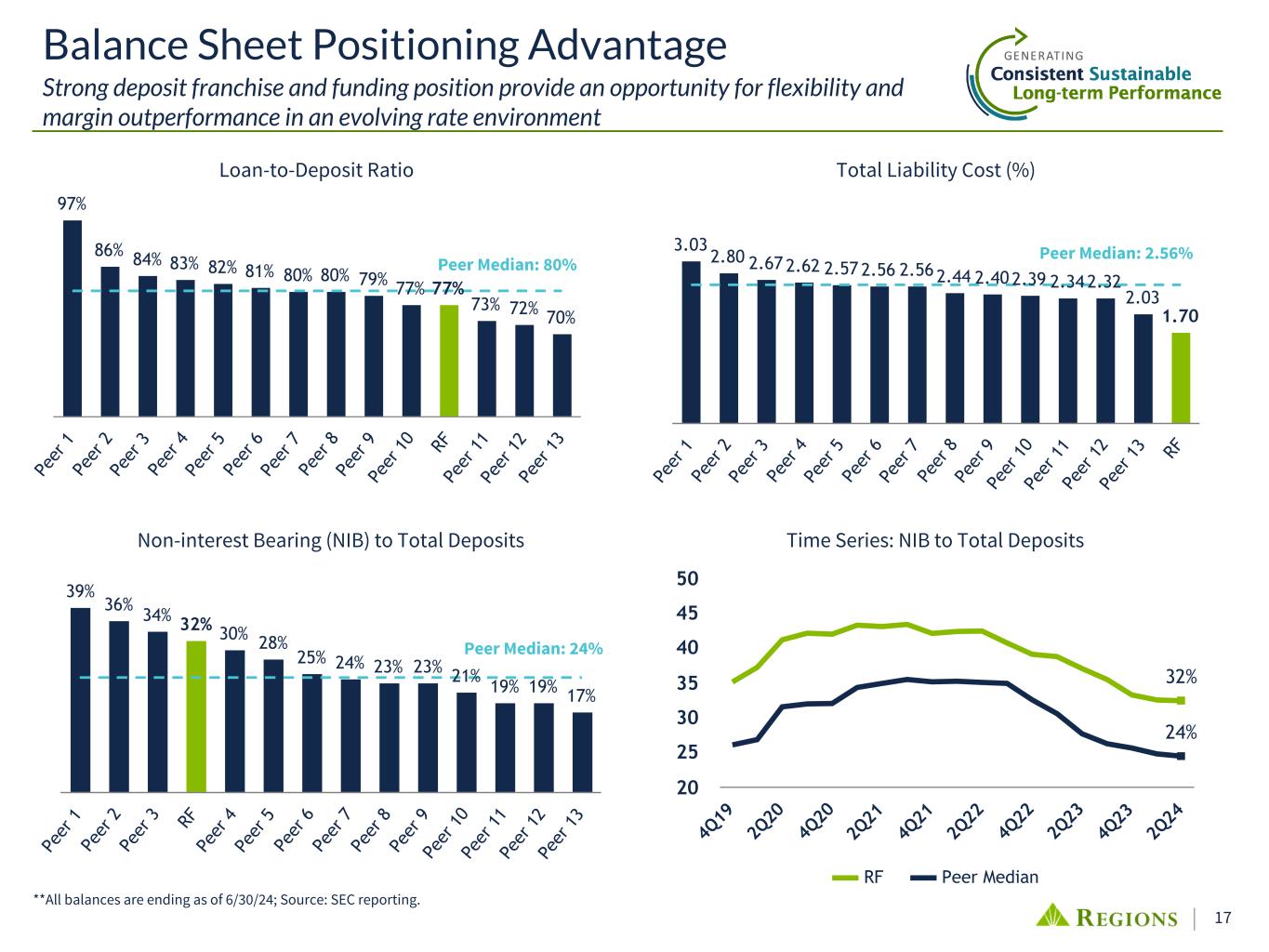 44 Deposit Advantage Well diversified deposit base vs. peers (1) As of 6/30/2024. Source: Bank Call Reports / SEC filings. Peers include CFG, CMA, FHN, FITB, HBAN, HWC, KEY, MTB, PNC, SNV, TFC, USB, ZION. ...Resulting in one of the highest mix of FDIC insured deposits amongst peers % of Total Deposits Insured By FDIC(1)% of Total Deposits Balance in Accounts Less than $250k(1) Regions holds a larger proportion of smaller deposit balance accounts when compared to the industry... 2Q24 Cumulative IB Deposit Beta 68% 64% 62% 60% 58% 57% 57% 55% 55% 54% 53% 53% 53% 50% Peer 6 RF Peer 1 Peer 10 Peer 4 Peer 3 Peer 12 Peer 13 Peer 2 Peer 11 Peer 8 Peer 5 Peer 9 Peer 7 55% 55% 55% 52% 50% 49% 48% 47% 47% 44% 44% 44% 42% 41% Peer 1 RF Peer 2 Peer 6 Peer 3 Peer 4 Peer 5 Peer 10 Peer 12 Peer 8 Peer 13 Peer 9 Peer 11 Peer 7 43% 50% 54% 54% 54% 55% 55% 56% 56% 58% 61% 62% 63% 67% RF Peer 4 Peer 1 Peer 7 Peer 8 Peer 3 Peer 2 Peer 6 Peer 11 Peer 5 Peer 12 Peer 13 Peer 10 Peer 9 • Regions ranks at or near the top vs. peers in several metrics measuring the retail/granular nature of our deposit base • These facts bear out in the advantaged beta observed this cycle