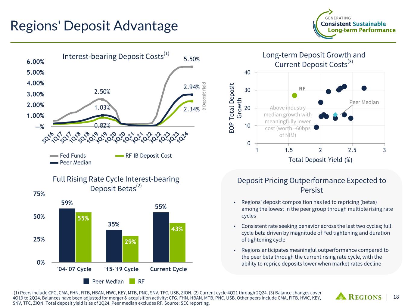 17 Balance Sheet Positioning Advantage Strong deposit franchise and funding position provide an opportunity for flexibility and margin outperformance in an evolving rate environment **All balances are ending as of 6/30/24; Source: SEC reporting. Loan-to-Deposit Ratio 97% 86% 84% 83% 82% 81% 80% 80% 79% 77% 77% 73% 72% 70% Pe er 1 Pe er 2 Pe er 3 Pe er 4 Pe er 5 Pe er 6 Pe er 7 Pe er 8 Pe er 9 Pe er 1 0 RF Pe er 1 1 Pe er 1 2 Pe er 1 3 Non-interest Bearing (NIB) to Total Deposits 39% 36% 34% 32% 30% 28% 25% 24% 23% 23% 21% 19% 19% 17% Pe er 1 Pe er 2 Pe er 3 RF Pe er 4 Pe er 5 Pe er 6 Pe er 7 Pe er 8 Pe er 9 Pe er 1 0 Pe er 1 1 Pe er 1 2 Pe er 1 3 Peer Median: 80% Peer Median: 24% Total Liability Cost (%) 3.03 2.80 2.67 2.62 2.57 2.56 2.56 2.44 2.40 2.39 2.34 2.32 2.03 1.70 Pe er 1 Pe er 2 Pe er 3 Pe er 4 Pe er 5 Pe er 6 Pe er 7 Pe er 8 Pe er 9 Pe er 1 0 Pe er 1 1 Pe er 1 2 Pe er 1 3 RF Peer Median: 2.56% Time Series: NIB to Total Deposits 32% 24% RF Peer Median 4Q 19 2Q 20 4Q 20 2Q 21 4Q 21 2Q 22 4Q 22 2Q 23 4Q 23 2Q 24 20 25 30 35 40 45 50