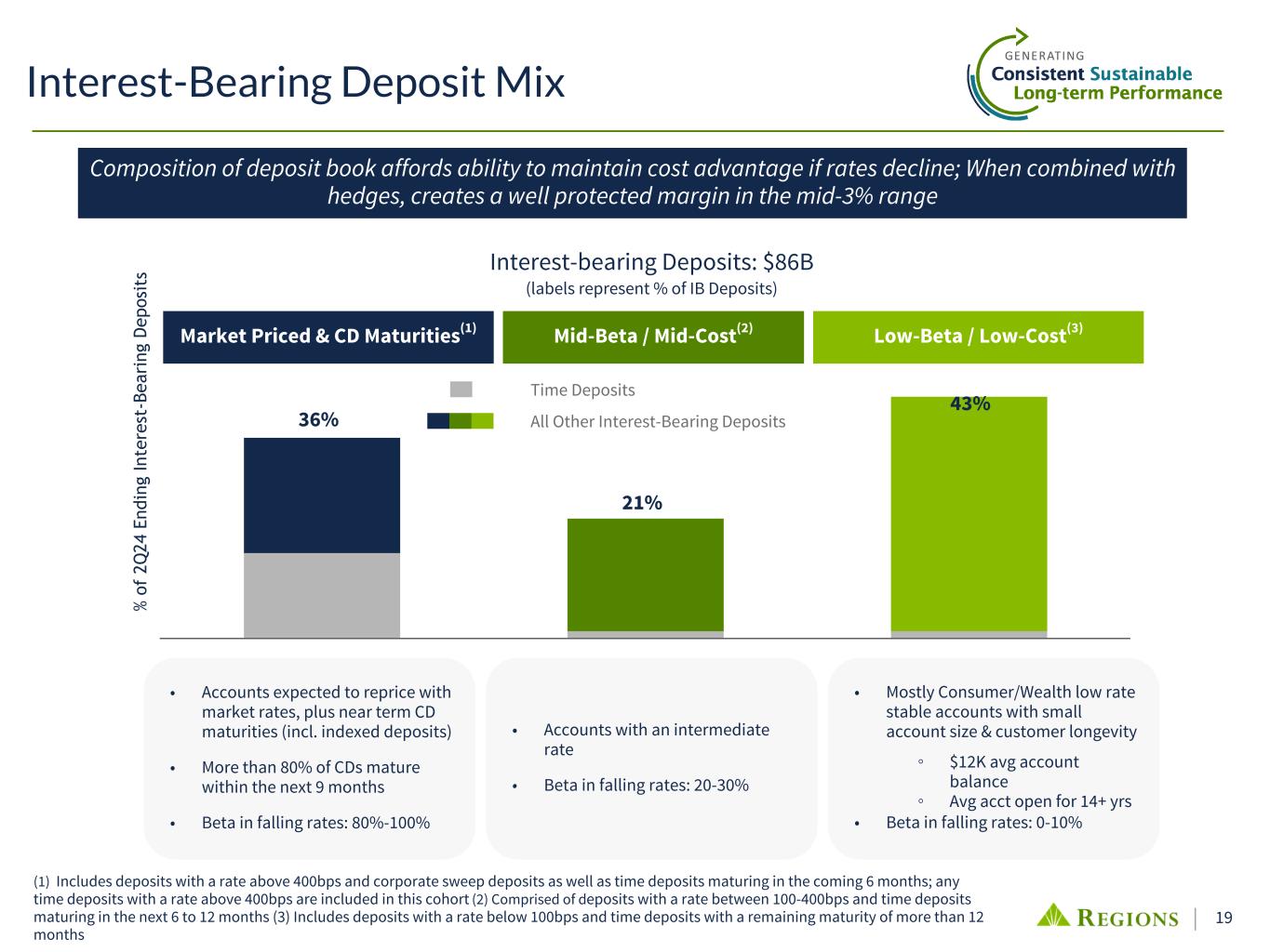 18 Total Deposit Yield (%) EO P To ta l D ep os it G ro w th 1 1.5 2 2.5 3 0 10 20 30 40 2.50% 5.50% 0.82% 2.34%1.03% 2.94% Fed Funds RF IB Deposit Cost Peer Median 3Q 16 1Q 17 3Q 17 1Q 18 3Q 18 1Q 19 3Q 19 1Q 20 3Q 20 1Q 21 3Q 21 1Q 22 3Q 22 1Q 23 3Q 23 1Q 24 —% 1.00% 2.00% 3.00% 4.00% 5.00% 6.00% 59% 35% 55% 55% 29% 43% Peer Median RF '04-'07 Cycle '15-'19 Cycle Current Cycle 0% 25% 50% 75% (1) Peers include CFG, CMA, FHN, FITB, HBAN, HWC, KEY, MTB, PNC, SNV, TFC, USB, ZION. (2) Current cycle 4Q21 through 2Q24. (3) Balance changes cover 4Q19 to 2Q24. Balances have been adjusted for merger & acquisition activity: CFG, FHN, HBAN, MTB, PNC, USB. Other peers include CMA, FITB, HWC, KEY, SNV, TFC, ZION. Total deposit yield is as of 2Q24. Peer median excludes RF. Source: SEC reporting. Interest-bearing Deposit Costs(1) Full Rising Rate Cycle Interest-bearing Deposit Betas(2) Long-term Deposit Growth and Current Deposit Costs(3) IB D ep os it Yi el d RF Peer Median Above industry median growth with meaningfully lower cost (worth ~60bps of NIM) Regions' Deposit Advantage Deposit Pricing Outperformance Expected to Persist • Regions' deposit composition has led to repricing (betas) among the lowest in the peer group through multiple rising rate cycles • Consistent rate seeking behavior across the last two cycles; full cycle beta driven by magnitude of Fed tightening and duration of tightening cycle • Regions anticipates meaningful outperformance compared to the peer beta through the current rising rate cycle, with the ability to reprice deposits lower when market rates decline