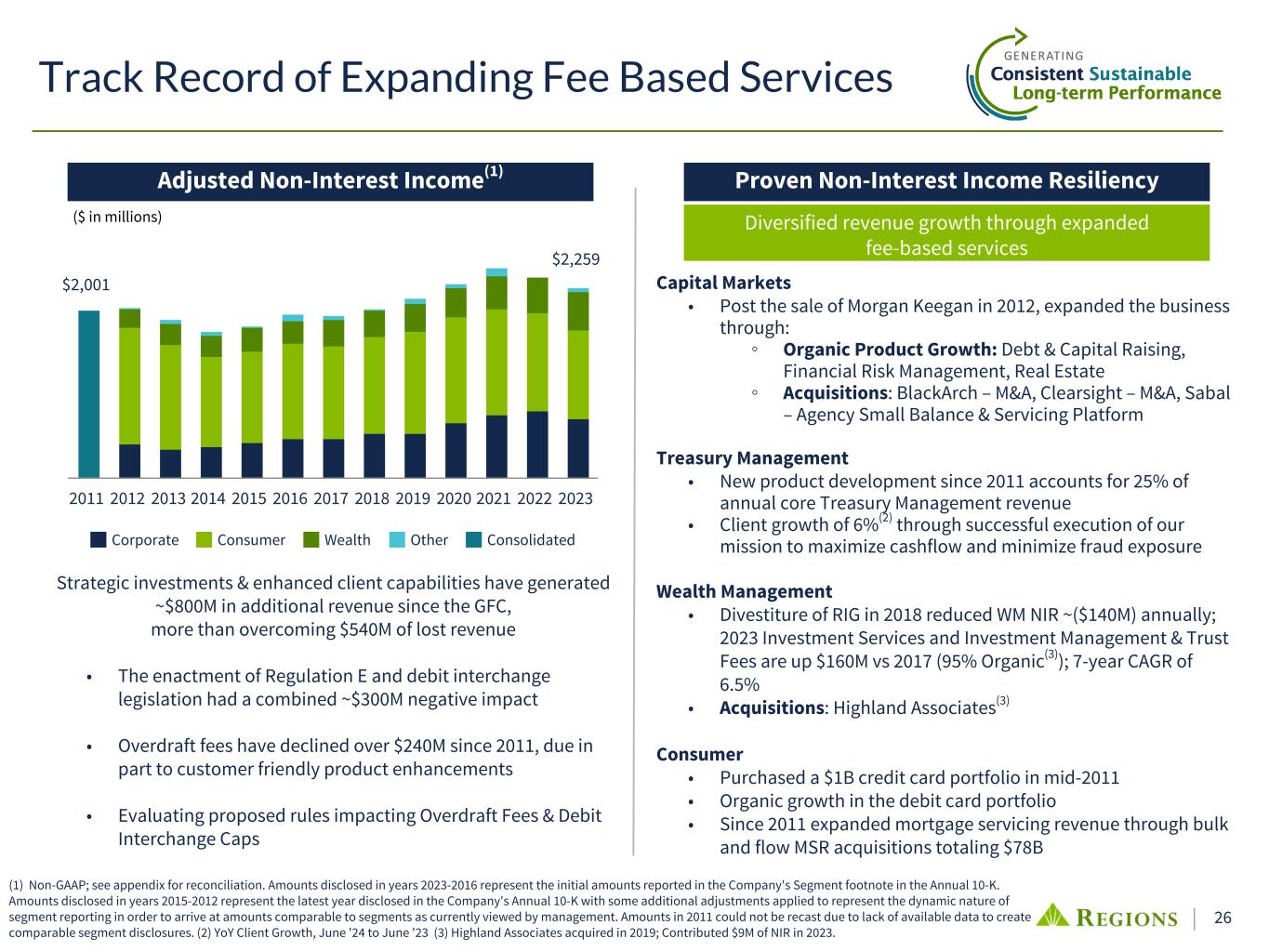 25 Consumer 45% Wealth Management 21% Corporate 34% 2Q24 Fee Revenue by Segment(1) Diversified Non-Interest Income • Consumer fee income categories include service charges on deposit accounts, card and ATM fees, and mortgage income generated through origination and servicing of residential mortgages Consumer Wealth Management • Wealth Management offers individuals, businesses, governmental institutions and non-profit entities a wide range of solutions to help protect, grow and transfer wealth • Fee offerings include trust and investment management, asset management, retirement and savings solutions and estate planning Corporate • Corporate fee income categories include capital markets and treasury management activities • Capital markets activities include capital raising, advisory and M&A services and mitigating risk with rate, commodity and foreign exchange products • Treasury management activities focus on delivering traditional cash management services, commercial card, and global trade products to clients $545M (1) Pie %'s exclude the non-interest income from the Other Segment totaling ($37) million.