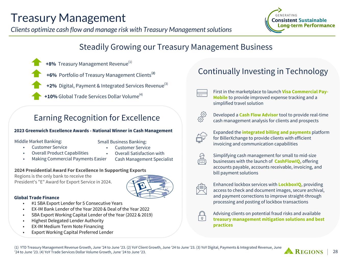 28 +8% Treasury Management Revenue(1) +6% Portfolio of Treasury Management Clients(2) +2% Digital, Payment & Integrated Services Revenue(3) +10% Global Trade Services Dollar Volume(4) Continually Investing in Technology First in the marketplace to launch Visa Commercial Pay- Mobile to provide improved expense tracking and a simplified travel solution Developed a Cash Flow Advisor tool to provide real-time cash management analysis for clients and prospects Expanded the integrated billing and payments platform for BillerXchange to provide clients with efficient invoicing and communication capabilities Simplifying cash management for small to mid-size businesses with the launch of CashFlowIQ, offering accounts payable, accounts receivable, invoicing, and bill payment solutions Enhanced lockbox services with LockboxIQ, providing access to check and document images, secure archival, and payment corrections to improve straight-through processing and posting of lockbox transactions Advising clients on potential fraud risks and available treasury management mitigation solutions and best practices Treasury Management Clients optimize cash flow and manage risk with Treasury Management solutions Global Trade Finance • #1 SBA Export Lender for 5 Consecutive Years • EX-IM Bank Lender of the Year 2020 & Deal of the Year 2022 • SBA Export Working Capital Lender of the Year (2022 & 2019) • Highest Delegated Lender Authority • EX-IM Medium Term Note Financing • Export Working Capital Preferred Lender 2023 Greenwich Excellence Awards - National Winner in Cash Management (1) YTD Treasury Management Revenue Growth, June '24 to June '23. (2) YoY Client Growth, June ‘24 to June ‘23. (3) YoY Digital, Payments & Integrated Revenue, June '24 to June '23. (4) YoY Trade Services Dollar Volume Growth, June ‘24 to June ‘23. Small Business Banking: • Customer Service • Overall Satisfaction with Cash Management Specialist Middle Market Banking: • Customer Service • Overall Product Capabilities • Making Commercial Payments Easier Earning Recognition for Excellence Steadily Growing our Treasury Management Business 2024 Presidential Award For Excellence In Supporting Exports Regions is the only bank to receive the President's "E" Award for Export Service in 2024.