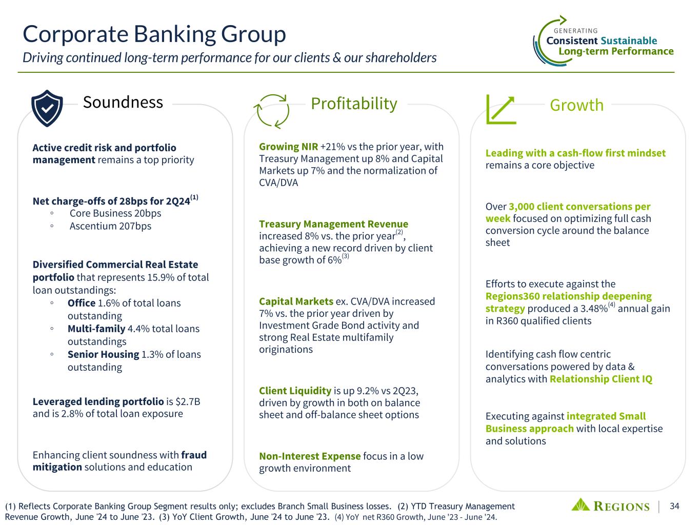 33 Consumer Banking Group Driving growth and customer engagement through strategic investments (1) J.D. Power 2024 U.S. Banking Online Satisfaction Study; among banks with $70B to $200B in deposits, which measures customer satisfaction with financial institutions’ website experience for banking account management. Visit jdpower.com/awards for more details. (2) iOS app store rating. Industry leader in beta and deposit costs while maintaining deposit balances; Continued focus on preserving advantageous deposit mix Credit Card high-quality new production increased 20% year-over- year through disciplined marketing optimization and intentional branch partnership Continued benefit from $8.0B MSR bulk acquisition completed in March 2024 2Q24 Avg. Loan Growth of 1.2%, year- over-year, and flat vs 1Q24 Regions Bank is the highest-rated bank in Forbes’ newest list of the top 300 U.S. companies for customer service J.D. Power(1) ranked Regions Bank #1 in customer satisfaction among regional bank online experiences 4 of the last 5 years Ranked 2nd in J.D. Power's U.S. Mortgage Servicer Satisfaction study #1 for payment volume and transactions through 1Q24 for new accounts and total accounts per Visa power score Top-decile in customer loyalty per Gallup 4.8 out of 5 Mobile app rating(2) Delivering Solid Customer Satisfaction & Loyalty Mobile capabilities including Spanish language option, bill pay upgrade, advanced keyword search, and Zelle for Small Business Digital SMS onboarding system for consumer checking customers Continued MSR bulk/flow acquisitions On-going investment in Branch Network to maintain and expand customer relationships Strategic Investments Across The Business Continuing to Deliver Strong Results