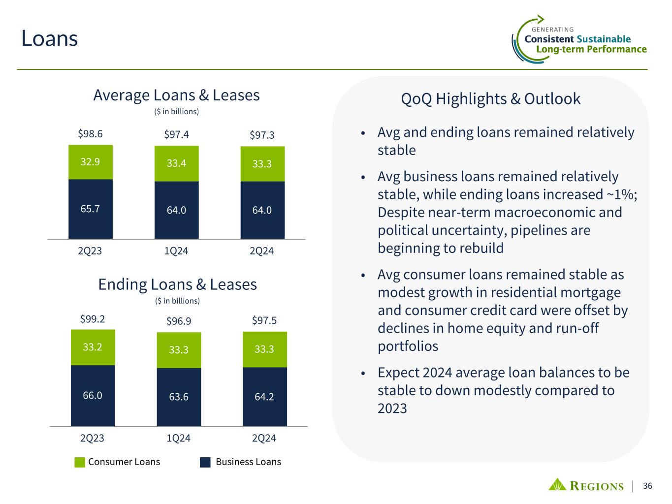 31 $1,111 $1,131 $1,004 56.4% 64.3% 57.6% Non-interest expense Efficiency ratio 2Q23 1Q24 2Q24 $3,387 $3,419 $3,434 $3,443 $3,541 $3,698 $3,886 $4,262 $135 Adjusted non-interest expense Incremental operational losses Include expenses associated with acquisitions 2016 2017 2018 2019 2020 2021 2022 2023 $1,110 $1,097 $1,032 $82 $22 $— 56.4% 60.6% 57.6% Adjusted non-interest expense Incremental operational losses Adjusted efficiency ratio 2Q23 1Q24 2Q24 • NIE decreased ~11% on a reported basis including $37M contingent reserve release related to a prior acquisition, an additional $4M for Regions' FDIC insurance special assessment accrual and ~$4M in severance-related costs; NIE decreased ~6% on an adjusted basis(1) driven by lower salaries & benefits, occupancy, and professional fees • Salaries & benefits decreased ~7% driven by lower HR related expenses (1Q restart of 401(k) match and payroll taxes) and base salaries partially offset by 2 additional months of merit • Occupancy expense decreased ~8% as the company continues to focus on reducing occupied square footage • Professional fees decreased ~11% driven by higher settlement expense in 1Q • Committed to prudent expense management, focusing on largest categories - S&B, occupancy and vendor spend • Expect full-year 2024 adjusted NIE to be $4.15-$4.2B; attributable primarily to higher revenue; Expect full-year 2024 operational losses to be ~$100M(4) 3.3% CAGR Non-Interest Expense (1) (1) Non-Interest Expense ($ in millions) Adj. Non-Interest Expense(1) ($ in millions) Adj. Non-Interest Expense(1)(2) ($ in millions) QoQ Highlights & Outlook (1) (3) (1) Non-GAAP; see appendix for reconciliation. (2) Excluding incremental operational losses in 2023, CAGR would be 2.9%. (3) 2Q20 acquisition of Ascentium Capital and 4Q21 acquisitions of EnerBank, Sabal Capital Partners, and ClearSight Advisors. (4) Included in 2024 FY adjusted NIE guidance.