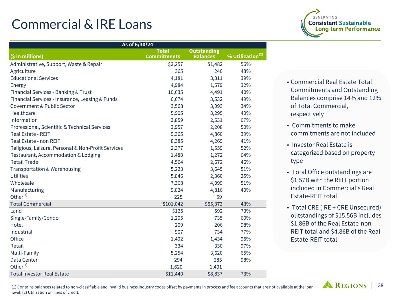 38 Commercial & IRE Loans As of 6/30/24 ($ in millions) Total Commitments Outstanding Balances % Utilization(2) Administrative, Support, Waste & Repair $2,257 $1,482 56% Agriculture 365 240 48% Educational Services 4,181 3,311 39% Energy 4,984 1,579 32% Financial Services - Banking & Trust 10,635 4,491 40% Financial Services - Insurance, Leasing & Funds 6,674 3,532 49% Government & Public Sector 3,568 3,093 34% Healthcare 5,905 3,295 40% Information 3,859 2,531 67% Professional, Scientific & Technical Services 3,957 2,208 50% Real Estate - REIT 9,365 4,860 39% Real Estate - non REIT 8,385 4,269 41% Religious, Leisure, Personal & Non-Profit Services 2,377 1,559 52% Restaurant, Accommodation & Lodging 1,480 1,272 64% Retail Trade 4,564 2,672 46% Transportation & Warehousing 5,223 3,645 51% Utilities 5,846 2,360 25% Wholesale 7,368 4,099 51% Manufacturing 9,824 4,816 40% Other(1) 225 59 Total Commercial $101,042 $55,373 43% Land $125 $92 73% Single-Family/Condo 1,205 735 60% Hotel 209 206 98% Industrial 907 734 77% Office 1,492 1,434 95% Retail 334 330 97% Multi-Family 5,254 3,620 65% Data Center 294 285 98% Other(1) 1,620 1,401 Total Investor Real Estate $11,440 $8,837 73% (1) Contains balances related to non-classifiable and invalid business industry codes offset by payments in process and fee accounts that are not available at the loan level. (2) Utilization on lines of credit. • Commercial Real Estate Total Commitments and Outstanding Balances comprise 14% and 12% of Total Commercial, respectively • Commitments to make commitments are not included • Investor Real Estate is categorized based on property type • Total Office outstandings are $1.57B with the REIT portion included in Commercial's Real Estate-REIT total • Total CRE (IRE + CRE Unsecured) outstandings of $15.56B includes $1.86B of the Real Estate-non REIT total and $4.86B of the Real Estate-REIT total