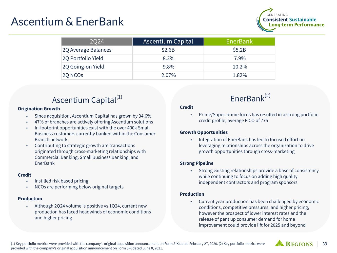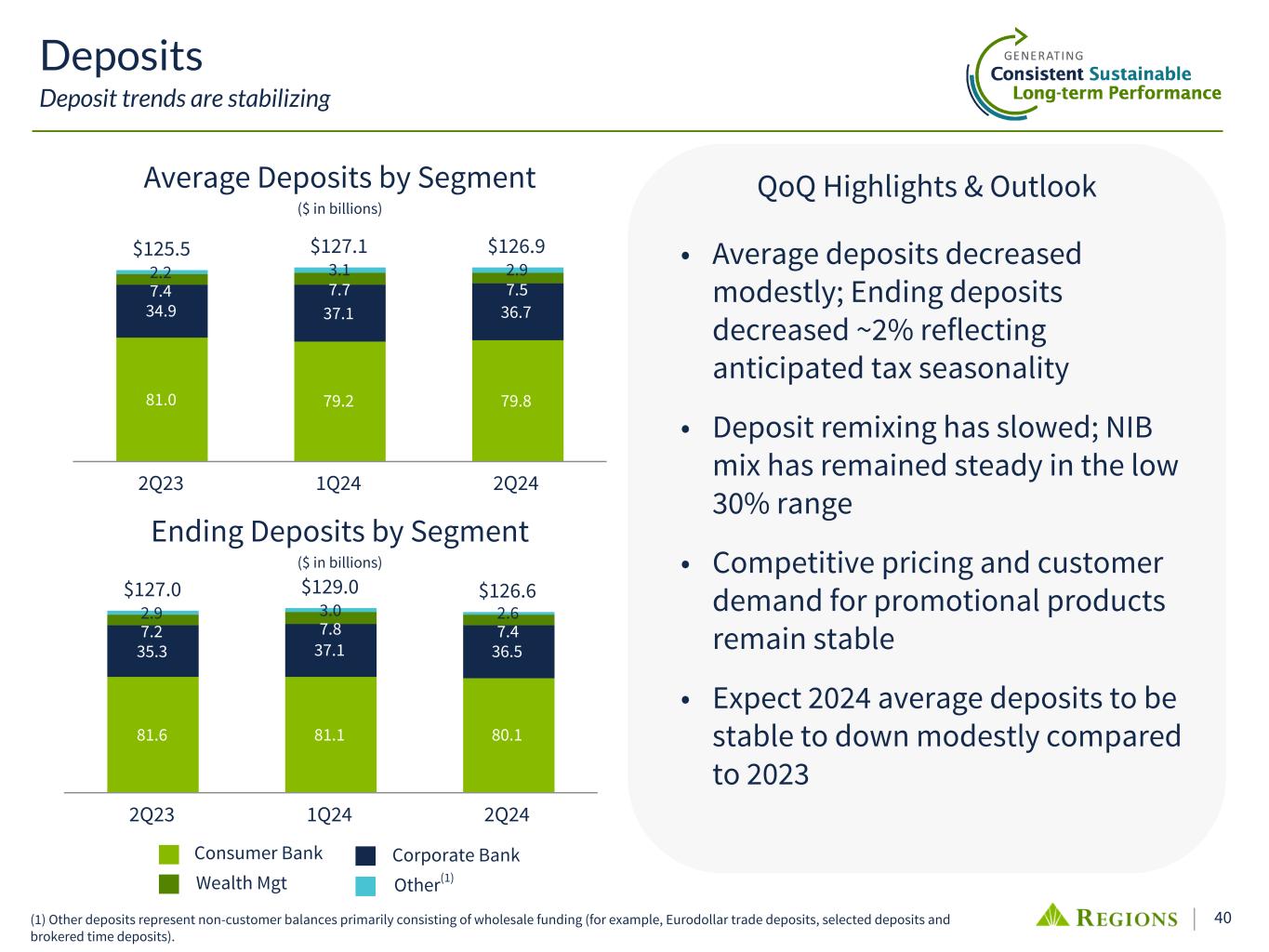 39 Ascentium & EnerBank (1) Key portfolio metrics were provided with the company's original acquisition announcement on Form 8-K dated February 27, 2020. (2) Key portfolio metrics were provided with the company's original acquisition announcement on Form 8-K dated June 8, 2021. 2Q24 Ascentium Capital EnerBank 2Q Average Balances $2.6B $5.2B 2Q Portfolio Yield 8.2% 7.9% 2Q Going-on Yield 9.8% 10.2% 2Q NCOs 2.07% 1.82% Ascentium Capital(1) Origination Growth • Since acquisition, Ascentium Capital has grown by 34.6% • 47% of branches are actively offering Ascentium solutions • In-footprint opportunities exist with the over 400k Small Business customers currently banked within the Consumer Branch network • Contributing to strategic growth are transactions originated through cross-marketing relationships with Commercial Banking, Small Business Banking, and EnerBank Credit • Instilled risk based pricing • NCOs are performing below original targets Production • Although 2Q24 volume is positive vs 1Q24, current new production has faced headwinds of economic conditions and higher pricing EnerBank(2) Credit • Prime/Super-prime focus has resulted in a strong portfolio credit profile; average FICO of 775 Growth Opportunities • Integration of EnerBank has led to focused effort on leveraging relationships across the organization to drive growth opportunities through cross-marketing Strong Pipeline • Strong existing relationships provide a base of consistency while continuing to focus on adding high quality independent contractors and program sponsors Production • Current year production has been challenged by economic conditions, competitive pressures, and higher pricing, however the prospect of lower interest rates and the release of pent up consumer demand for home improvement could provide lift for 2025 and beyond