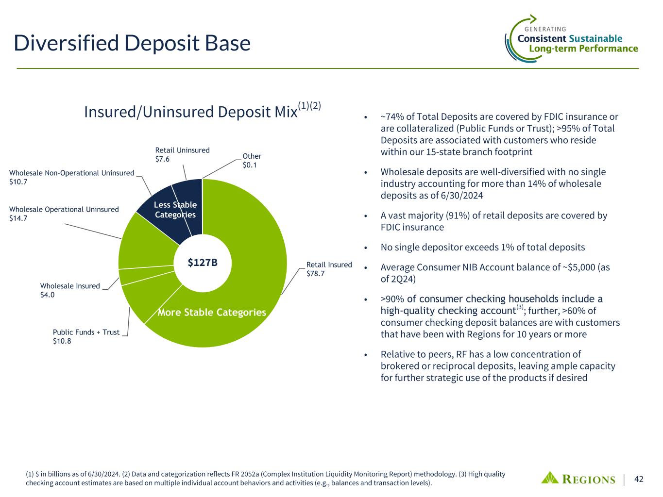 41 • Pre-pandemic, customers maintained a relatively steady ratio of checking balances to spending activity. • After a period of elevated balances during 2020-2023, customers have returned to a similar pre-pandemic level of ~1.7x monthly spending activity. • The return to historical levels suggests a return to more normal and stable balance patterns in checking Checking Balances & Spending Levels % Ch an ge v s. 2 01 9 Change in Checking Deposits Change in Spending Activity 2019 Average 1Q22 2Q24 —% 20% 40% 60% Balances and Avg Monthly Consumer & Wealth Spending vs. 2019(1) 1.7 2.2 1.7 2019 Average 1Q22 2Q24 Ratio of Consumer & Wealth Checking Balances to Monthly Spending(1) Ratio back to 2019 trend level (1) 2Q24 data point in charts excludes the month of April to avoid tax-payment-related variation. Balances are consumer and private wealth checking average balances and exclude branch small business. Spending includes all debit activity except wires and internal transfers between Regions accounts; ratio reflects an average of the months in the period.
