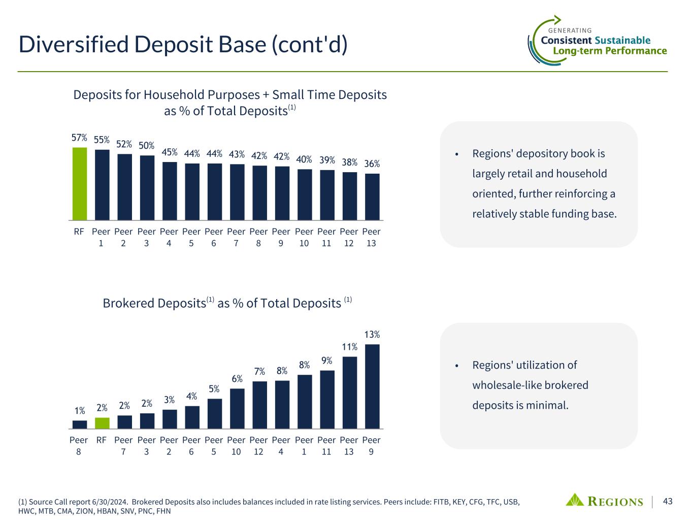 42 Diversified Deposit Base Insured/Uninsured Deposit Mix(1)(2) • ~74% of Total Deposits are covered by FDIC insurance or are collateralized (Public Funds or Trust); >95% of Total Deposits are associated with customers who reside within our 15-state branch footprint • Wholesale deposits are well-diversified with no single industry accounting for more than 14% of wholesale deposits as of 6/30/2024 • A vast majority (91%) of retail deposits are covered by FDIC insurance • No single depositor exceeds 1% of total deposits • Average Consumer NIB Account balance of ~$5,000 (as of 2Q24) • >90% of consumer checking households include a high-quality checking account(3); further, >60% of consumer checking deposit balances are with customers that have been with Regions for 10 years or more • Relative to peers, RF has a low concentration of brokered or reciprocal deposits, leaving ample capacity for further strategic use of the products if desired Retail Insured $78.7 Public Funds + Trust $10.8 Wholesale Insured $4.0 Wholesale Operational Uninsured $14.7 Wholesale Non-Operational Uninsured $10.7 Retail Uninsured $7.6 Other $0.1 Less Stable Categories (1) $ in billions as of 6/30/2024. (2) Data and categorization reflects FR 2052a (Complex Institution Liquidity Monitoring Report) methodology. (3) High quality checking account estimates are based on multiple individual account behaviors and activities (e.g., balances and transaction levels). More Stable Categories $127B