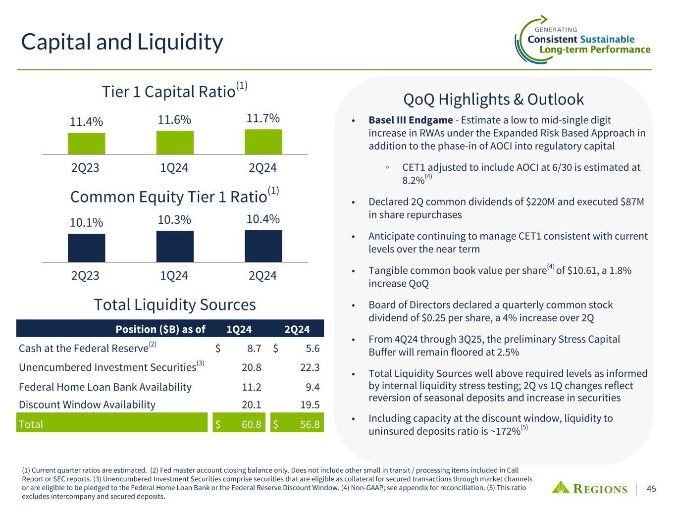 45 • Basel III Endgame - Estimate a low to mid-single digit increase in RWAs under the Expanded Risk Based Approach in addition to the phase-in of AOCI into regulatory capital ◦ CET1 adjusted to include AOCI at 6/30 is estimated at 8.2%(4) • Declared 2Q common dividends of $220M and executed $87M in share repurchases • Anticipate continuing to manage CET1 consistent with current levels over the near term • Tangible common book value per share(4) of $10.61, a 1.8% increase QoQ • Board of Directors declared a quarterly common stock dividend of $0.25 per share, a 4% increase over 2Q • From 4Q24 through 3Q25, the preliminary Stress Capital Buffer will remain floored at 2.5% • Total Liquidity Sources well above required levels as informed by internal liquidity stress testing; 2Q vs 1Q changes reflect reversion of seasonal deposits and increase in securities • Including capacity at the discount window, liquidity to uninsured deposits ratio is ~172%(5) 10.1% 10.3% 10.4% 2Q23 1Q24 2Q24 Capital and Liquidity 11.4% 11.6% 11.7% 2Q23 1Q24 2Q24 Tier 1 Capital Ratio(1) Common Equity Tier 1 Ratio(1) Position ($B) as of 1Q24 2Q24 Cash at the Federal Reserve(2) $ 8.7 $ 5.6 Unencumbered Investment Securities(3) 20.8 22.3 Federal Home Loan Bank Availability 11.2 9.4 Discount Window Availability 20.1 19.5 Total $ 60.8 $ 56.8 (1) Current quarter ratios are estimated. (2) Fed master account closing balance only. Does not include other small in transit / processing items included in Call Report or SEC reports. (3) Unencumbered Investment Securities comprise securities that are eligible as collateral for secured transactions through market channels or are eligible to be pledged to the Federal Home Loan Bank or the Federal Reserve Discount Window. (4) Non-GAAP; see appendix for reconciliation. (5) This ratio excludes intercompany and secured deposits. Total Liquidity Sources QoQ Highlights & Outlook