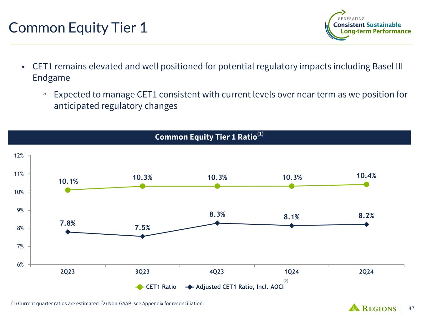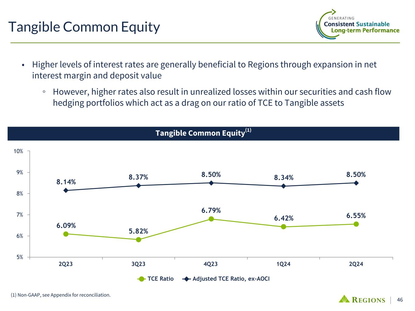 46 6.09% 5.82% 6.79% 6.42% 6.55% 8.14% 8.37% 8.50% 8.34% 8.50% TCE Ratio Adjusted TCE Ratio, ex-AOCI 2Q23 3Q23 4Q23 1Q24 2Q24 5% 6% 7% 8% 9% 10% Tangible Common Equity (1) Non-GAAP, see Appendix for reconciliation. • Higher levels of interest rates are generally beneficial to Regions through expansion in net interest margin and deposit value ◦ However, higher rates also result in unrealized losses within our securities and cash flow hedging portfolios which act as a drag on our ratio of TCE to Tangible assets Tangible Common Equity(1)