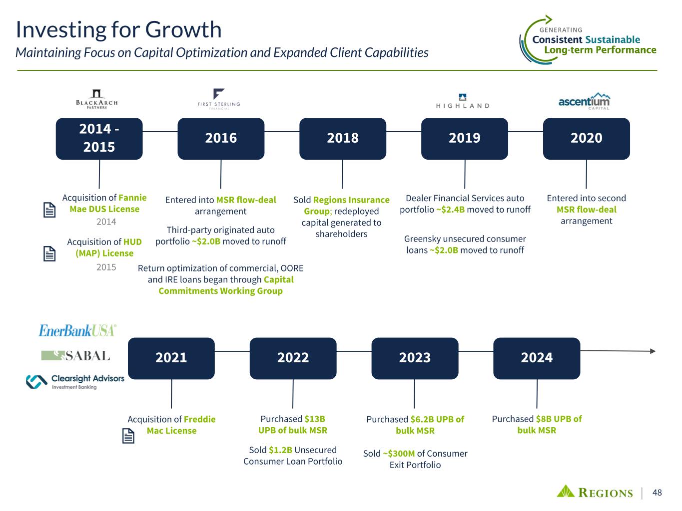 48 Return optimization of commercial, OORE and IRE loans began through Capital Commitments Working Group Investing for Growth Maintaining Focus on Capital Optimization and Expanded Client Capabilities 2014 - 2015 2018 2019 20202016 Acquisition of HUD (MAP) License Acquisition of Fannie Mae DUS License 2014 2015 Third-party originated auto portfolio ~$2.0B moved to runoff Entered into MSR flow-deal arrangement Sold Regions Insurance Group; redeployed capital generated to shareholders Greensky unsecured consumer loans ~$2.0B moved to runoff Dealer Financial Services auto portfolio ~$2.4B moved to runoff Entered into second MSR flow-deal arrangement 2023 202420222021 Acquisition of Freddie Mac License Purchased $13B UPB of bulk MSR Sold $1.2B Unsecured Consumer Loan Portfolio Purchased $6.2B UPB of bulk MSR Sold ~$300M of Consumer Exit Portfolio Purchased $8B UPB of bulk MSR