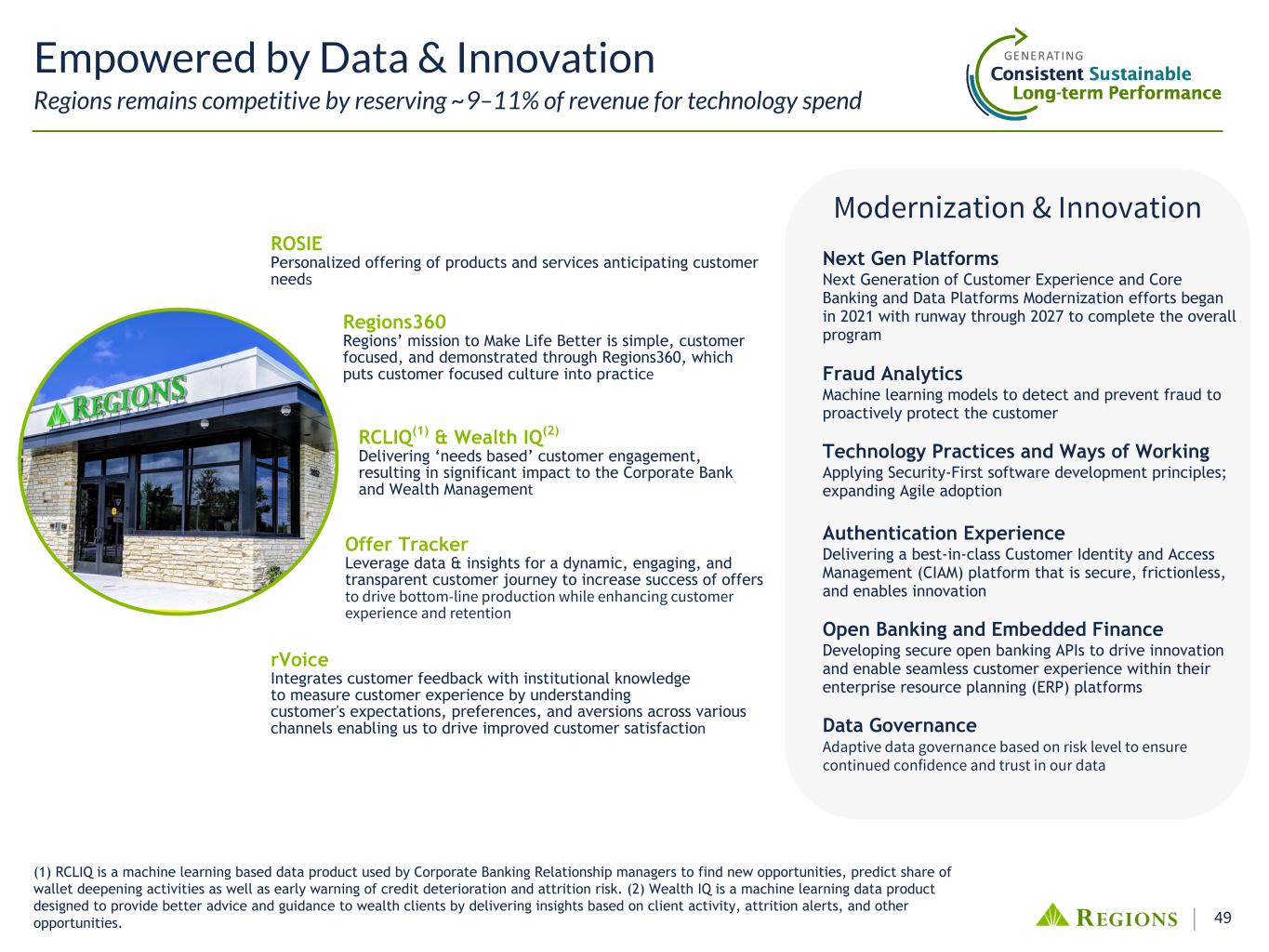 49 Empowered by Data & Innovation Regions remains competitive by reserving ~9–11% of revenue for technology spend Next Gen Platforms Next Generation of Customer Experience and Core Banking and Data Platforms Modernization efforts began in 2021 with runway through 2027 to complete the overall program Fraud Analytics Machine learning models to detect and prevent fraud to proactively protect the customer Technology Practices and Ways of Working Applying Security-First software development principles; expanding Agile adoption Authentication Experience Delivering a best-in-class Customer Identity and Access Management (CIAM) platform that is secure, frictionless, and enables innovation Open Banking and Embedded Finance Developing secure open banking APIs to drive innovation and enable seamless customer experience within their enterprise resource planning (ERP) platforms Data Governance Adaptive data governance based on risk level to ensure continued confidence and trust in our data Modernization & Innovation ROSIE Personalized offering of products and services anticipating customer needs Regions360 Regions’ mission to Make Life Better is simple, customer focused, and demonstrated through Regions360, which puts customer focused culture into practice RCLIQ(1) & Wealth IQ(2) Delivering ‘needs based’ customer engagement, resulting in significant impact to the Corporate Bank and Wealth Management Offer Tracker Leverage data & insights for a dynamic, engaging, and transparent customer journey to increase success of offers to drive bottom-line production while enhancing customer experience and retention rVoice Integrates customer feedback with institutional knowledge to measure customer experience by understanding customer's expectations, preferences, and aversions across various channels enabling us to drive improved customer satisfaction (1) RCLIQ is a machine learning based data product used by Corporate Banking Relationship managers to find new opportunities, predict share of wallet deepening activities as well as early warning of credit deterioration and attrition risk. (2) Wealth IQ is a machine learning data product designed to provide better advice and guidance to wealth clients by delivering insights based on client activity, attrition alerts, and other opportunities.