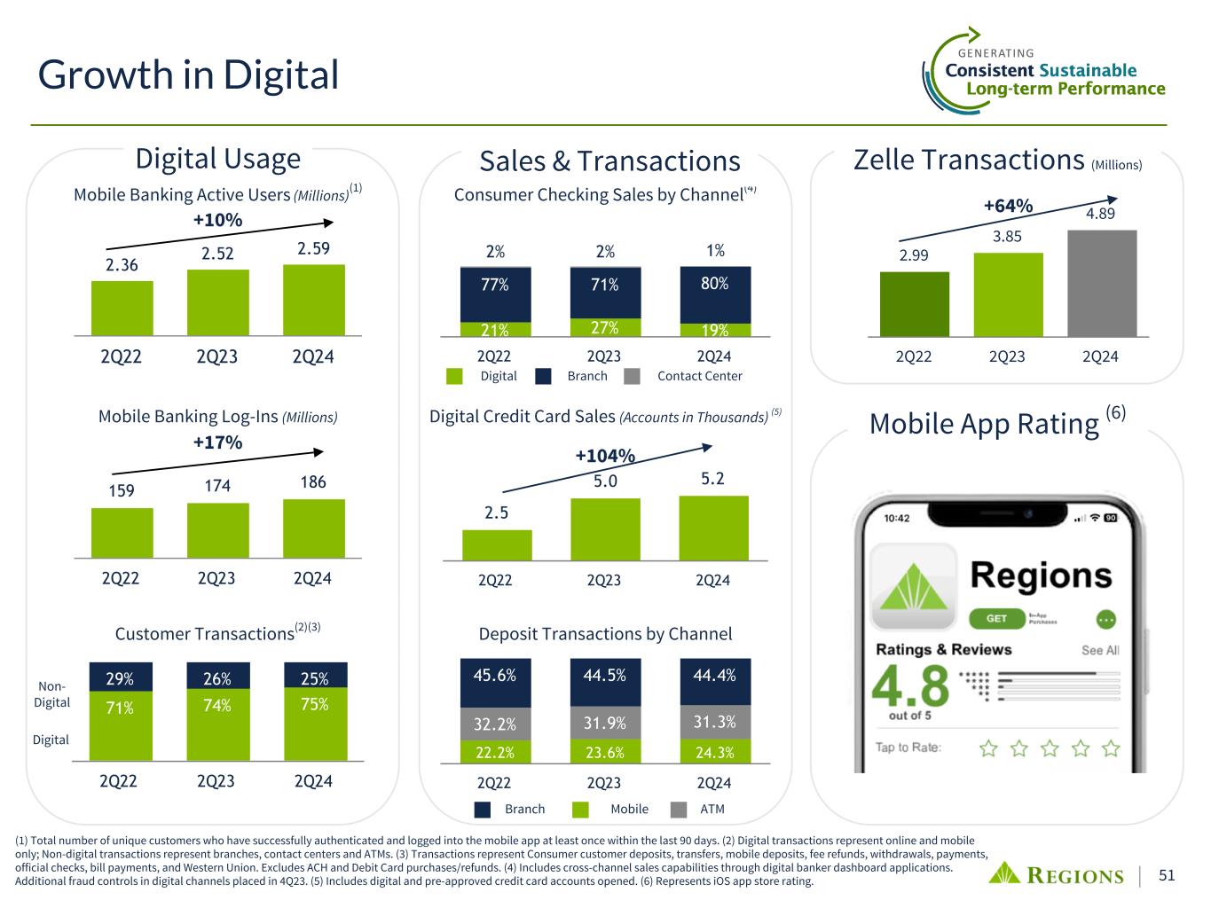 50 Expanded Regions Reggie® Messaging External- and internal-facing messaging volume and usage has grown by 6% in 2Q24 Vs 2Q23 Automated Non-Agent Interactions 86.6% average interaction resolution rate2 in 2Q24 Authentication Improvements Deployed additional authentication and fraud risk mitigation capabilities within our interactive voice response (IVR) platform – further securing the customer experience. Expansion of Customer Interaction Points Reggie® Messaging through web/mobile volume has increased 8.5% 2Q24 vs 2Q23. Average messaging customer satisfaction (CSAT) has increased 3.1% points to 81.3% in 2Q24 vs 2Q23. Average percentage of daily customer contacts went up to 16% 2Q24 vs 13% 2Q23. Faster Transactions In 2Q24, Corporate3 Real Time Payment transactions increased to 1.62 M (totaling $801.1M) over the 1.36M transactions (totaling $527.6M) in 2Q23. Delivering Digital-First Solutions Regions recently implemented Zelle for Small Business – providing over 300K of our small business customers with convenient access to fast, secure, and convenient peer-to-peer payments services in both our online and mobile channels. This integration allows businesses to send and receive payments instantly – enhancing cash flow and operational efficiency. Differentiating Through Customer Experience (1) Mobile 4.8 rating represents iOS app store rating. (2) IVR containment rate. (3) Includes Commercial payments. Regions Tap to BankSM Regions Tap to BankSM is active on nearly 2,000 ATMs across the bank's 15-state footprint – enabling faster, more convenient ATM banking, enhanced security by reducing the risk of fraud from skimming devices, an expected reduction in card captures, and less downtime for card reader repairs. Innovating Operations In 2024, J.D. Power* ranked Regions Bank #1 in Customer Satisfaction among Regional Bank Online Experiences – a first-place ranking that the bank has proudly maintained for 4 of the last 5 years. *J.D. Power 2024 U.S. Banking Online Satisfaction Study; among banks with $70B to $200B in deposits, which measures customer satisfaction with financial institutions' website experience for banking account management. Visit jdpower.com/awards for more details. Customer Satisfaction Adoption 2.8% increase in Mobile users in 2Q24 compared to 2Q23 Digital Enhancements Launched Zelle for Small Business, card services enhancements including LockIt conversion, Relationship IQ corporate portal enhancements, and Reggie® Messaging Virtual Assistant Contact Center updates Customer Transactions 75% of 2Q24 Retail customer transactions initiated in Digital, 4% growth YoY Zelle 27% increase in transaction volume in 2Q24 compared to 2Q23 Digital Acceleration Enabling Through Technology CashFlowIQ, CashFlow Advisor for Small-, Mid-Size Business Clients Regions recently launched new cash management client tools CashFlowIQ and CashFlow Advisor – delivering digital cash capabilities to small- and mid-size businesses. CashFlowIQ provides bill payment, accounts payable and receivable, and invoice generation – streamlining all the tools needed to run a business. 1