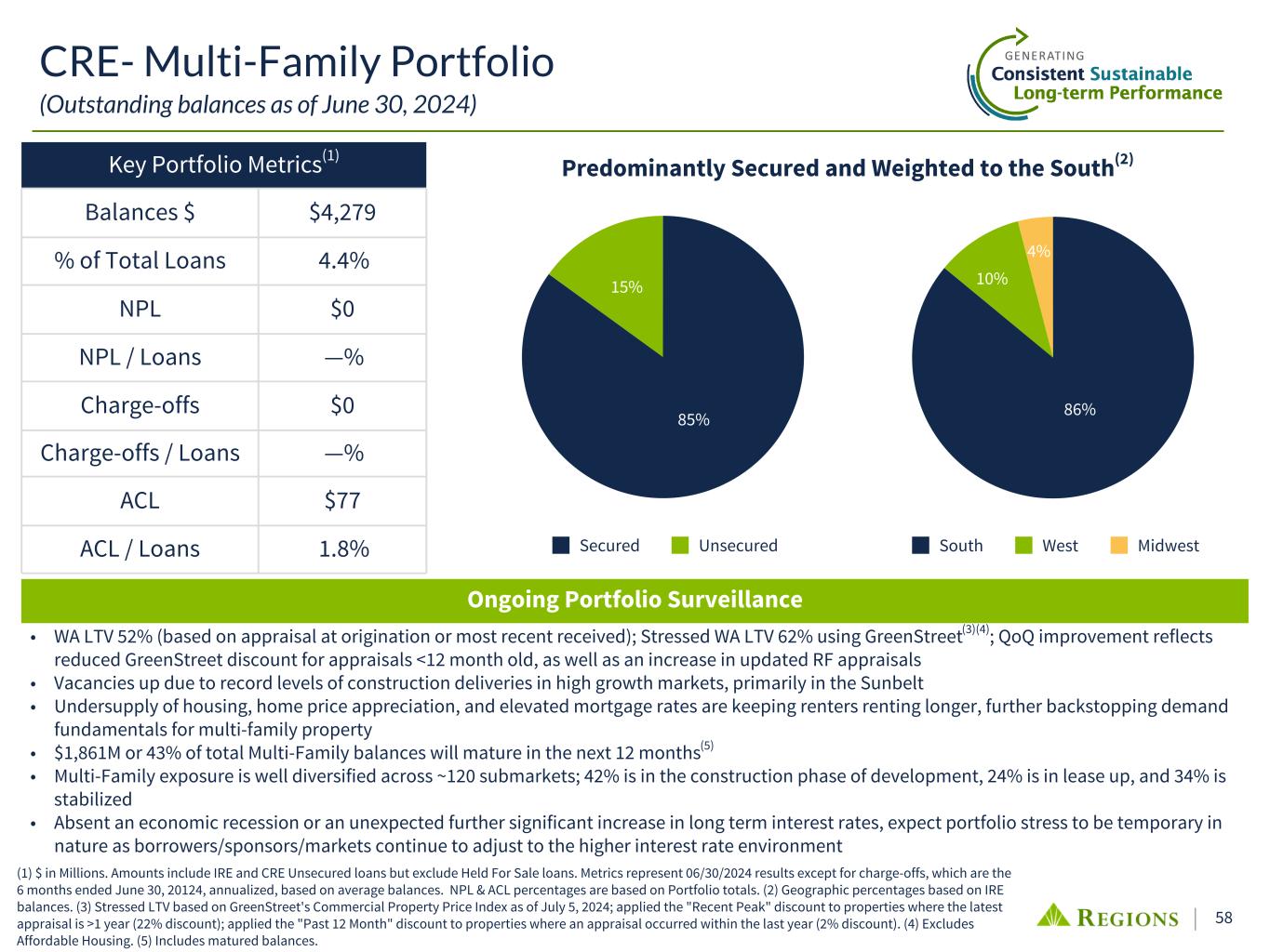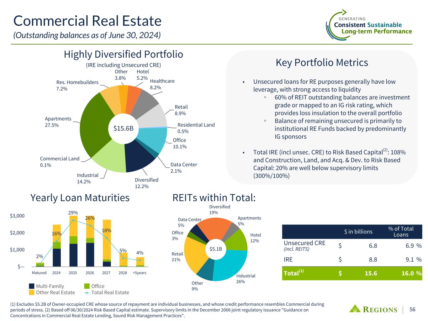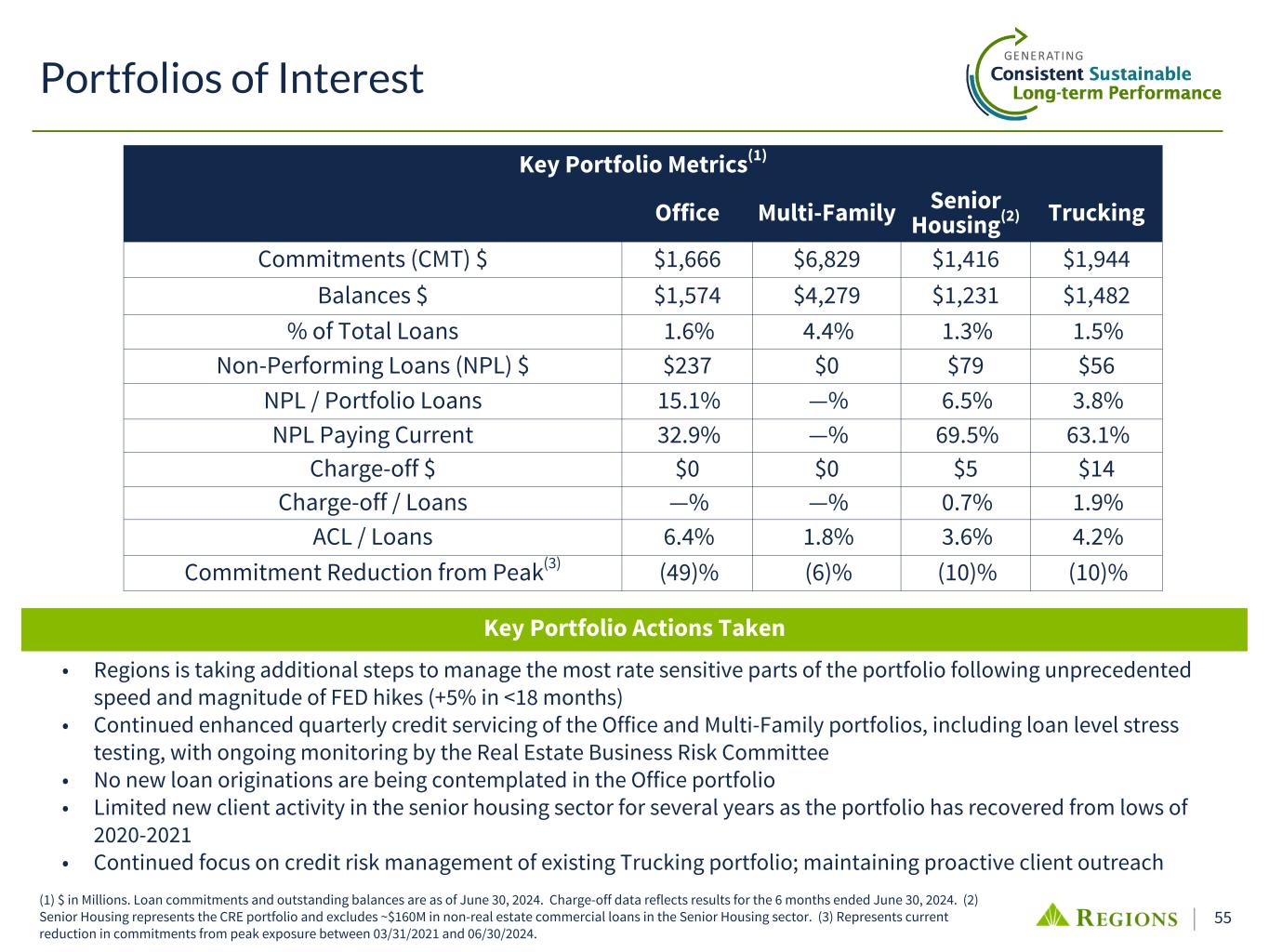 55 Portfolios of Interest • Regions is taking additional steps to manage the most rate sensitive parts of the portfolio following unprecedented speed and magnitude of FED hikes (+5% in <18 months) • Continued enhanced quarterly credit servicing of the Office and Multi-Family portfolios, including loan level stress testing, with ongoing monitoring by the Real Estate Business Risk Committee • No new loan originations are being contemplated in the Office portfolio • Limited new client activity in the senior housing sector for several years as the portfolio has recovered from lows of 2020-2021 • Continued focus on credit risk management of existing Trucking portfolio; maintaining proactive client outreach Key Portfolio Actions Taken Key Portfolio Metrics(1) Office Multi-Family Senior Housing(2) Trucking Commitments (CMT) $ $1,666 $6,829 $1,416 $1,944 Balances $ $1,574 $4,279 $1,231 $1,482 % of Total Loans 1.6% 4.4% 1.3% 1.5% Non-Performing Loans (NPL) $ $237 $0 $79 $56 NPL / Portfolio Loans 15.1% —% 6.5% 3.8% NPL Paying Current 32.9% —% 69.5% 63.1% Charge-off $ $0 $0 $5 $14 Charge-off / Loans —% —% 0.7% 1.9% ACL / Loans 6.4% 1.8% 3.6% 4.2% Commitment Reduction from Peak(3) (49)% (6)% (10)% (10)% (1) $ in Millions. Loan commitments and outstanding balances are as of June 30, 2024. Charge-off data reflects results for the 6 months ended June 30, 2024. (2) Senior Housing represents the CRE portfolio and excludes ~$160M in non-real estate commercial loans in the Senior Housing sector. (3) Represents current reduction in commitments from peak exposure between 03/31/2021 and 06/30/2024.