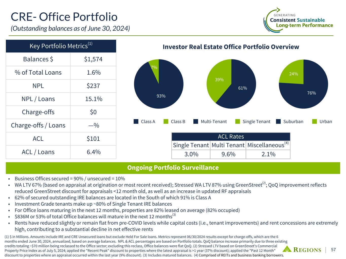 56 Commercial Real Estate (Outstanding balances as of June 30, 2024) Highly Diversified Portfolio (IRE including Unsecured CRE) (1) Excludes $5.2B of Owner-occupied CRE whose source of repayment are individual businesses, and whose credit performance resembles Commercial during periods of stress. (2) Based off 06/30/2024 Risk Based Capital estimate. Supervisory limits in the December 2006 joint regulatory issuance "Guidance on Concentrations in Commercial Real Estate Lending, Sound Risk Management Practices". Res. Homebuilders 7.2% Other 3.8% Hotel 5.2% Healthcare 8.2% Retail 8.9% Residential Land 0.5% Office 10.1% Data Center 2.1% Diversified 12.2% Industrial 14.2% Commercial Land 0.1% Apartments 27.5% $15.6B $ in billions % of Total Loans Unsecured CRE (incl. REITS) $ 6.8 6.9 % IRE $ 8.8 9.1 % Total(1) $ 15.6 16.0 % Yearly Loan Maturities 2% 16% 29% 26% 18% 5% 4% Multi-Family Office Other Real Estate Total Real Estate Matured 2024 2025 2026 2027 2028 >5years $— $1,000 $2,000 $3,000 Office 3% Data Center 5% Diversified 19% Apartments 5% Hotel 12% Industrial 26%Other 9% Retail 21% REITs within Total: $5.1B • Unsecured loans for RE purposes generally have low leverage, with strong access to liquidity ◦ 60% of REIT outstanding balances are investment grade or mapped to an IG risk rating, which provides loss insulation to the overall portfolio ◦ Balance of remaining unsecured is primarily to institutional RE Funds backed by predominantly IG sponsors • Total IRE (incl unsec. CRE) to Risk Based Capital(2): 108% and Construction, Land, and Acq. & Dev. to Risk Based Capital: 20% are well below supervisory limits (300%/100%) Key Portfolio Metrics