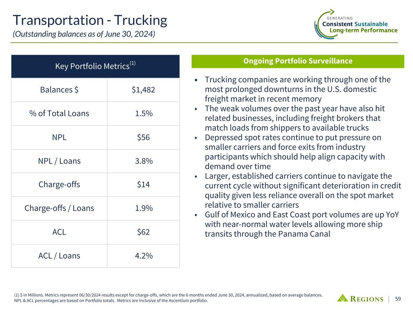 59 Transportation - Trucking (Outstanding balances as of June 30, 2024) (1) $ in Millions. Metrics represent 06/30/2024 results except for charge-offs, which are the 6 months ended June 30, 2024, annualized, based on average balances. NPL & ACL percentages are based on Portfolio totals. Metrics are inclusive of the Ascentium portfolio. Key Portfolio Metrics(1) Balances $ $1,482 % of Total Loans 1.5% NPL $56 NPL / Loans 3.8% Charge-offs $14 Charge-offs / Loans 1.9% ACL $62 ACL / Loans 4.2% • Trucking companies are working through one of the most prolonged downturns in the U.S. domestic freight market in recent memory • The weak volumes over the past year have also hit related businesses, including freight brokers that match loads from shippers to available trucks • Depressed spot rates continue to put pressure on smaller carriers and force exits from industry participants which should help align capacity with demand over time • Larger, established carriers continue to navigate the current cycle without significant deterioration in credit quality given less reliance overall on the spot market relative to smaller carriers • Gulf of Mexico and East Coast port volumes are up YoY with near-normal water levels allowing more ship transits through the Panama Canal Ongoing Portfolio Surveillance