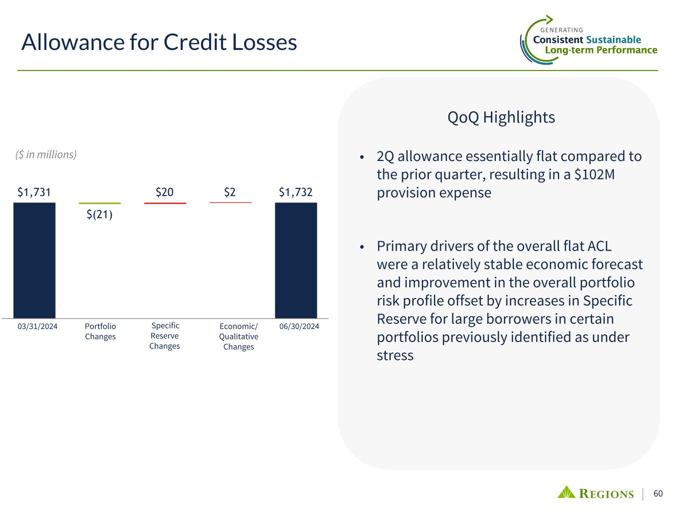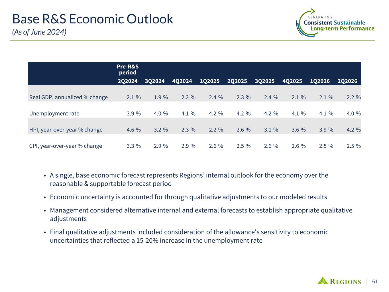 61 Pre-R&S period 2Q2024 3Q2024 4Q2024 1Q2025 2Q2025 3Q2025 4Q2025 1Q2026 2Q2026 Real GDP, annualized % change 2.1 % 1.9 % 2.2 % 2.4 % 2.3 % 2.4 % 2.1 % 2.1 % 2.2 % Unemployment rate 3.9 % 4.0 % 4.1 % 4.2 % 4.2 % 4.2 % 4.1 % 4.1 % 4.0 % HPI, year-over-year % change 4.6 % 3.2 % 2.3 % 2.2 % 2.6 % 3.1 % 3.6 % 3.9 % 4.2 % CPI, year-over-year % change 3.3 % 2.9 % 2.9 % 2.6 % 2.5 % 2.6 % 2.6 % 2.5 % 2.5 % Base R&S Economic Outlook (As of June 2024) • A single, base economic forecast represents Regions’ internal outlook for the economy over the reasonable & supportable forecast period • Economic uncertainty is accounted for through qualitative adjustments to our modeled results • Management considered alternative internal and external forecasts to establish appropriate qualitative adjustments • Final qualitative adjustments included consideration of the allowance's sensitivity to economic uncertainties that reflected a 15-20% increase in the unemployment rate