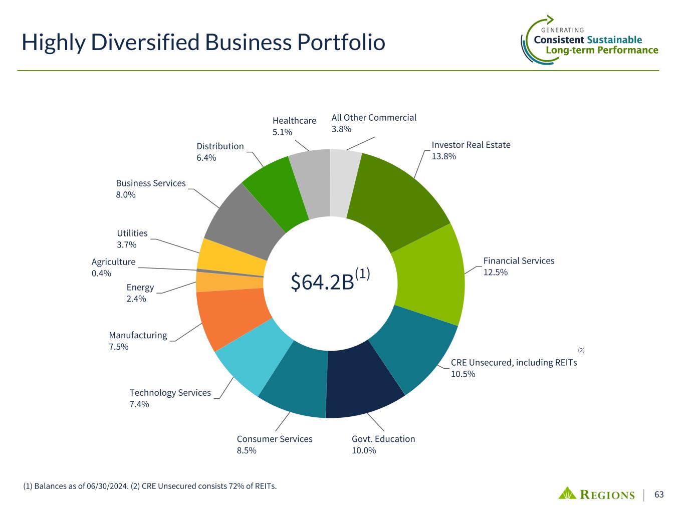 63 All Other Commercial 3.8% Investor Real Estate 13.8% Financial Services 12.5% CRE Unsecured, including REITs 10.5% Govt. Education 10.0% Consumer Services 8.5% Technology Services 7.4% Manufacturing 7.5% Energy 2.4% Agriculture 0.4% Utilities 3.7% Business Services 8.0% Distribution 6.4% Healthcare 5.1% Highly Diversified Business Portfolio $64.2B(1) (1) Balances as of 06/30/2024. (2) CRE Unsecured consists 72% of REITs. (2)