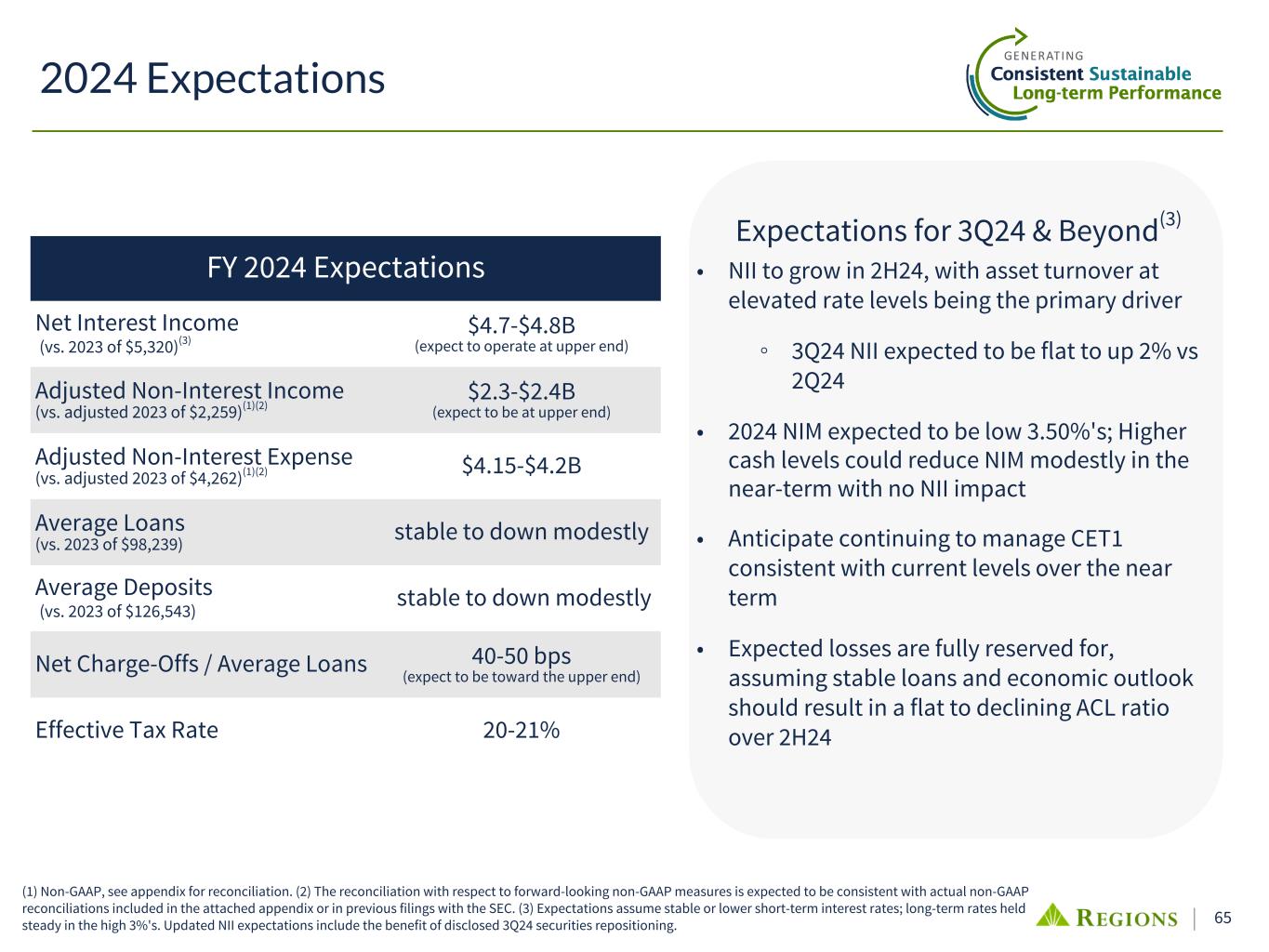 65 2024 Expectations (1) Non-GAAP, see appendix for reconciliation. (2) The reconciliation with respect to forward-looking non-GAAP measures is expected to be consistent with actual non-GAAP reconciliations included in the attached appendix or in previous filings with the SEC. (3) Expectations assume stable or lower short-term interest rates; long-term rates held steady in the high 3%'s. Updated NII expectations include the benefit of disclosed 3Q24 securities repositioning. FY 2024 Expectations Net Interest Income (vs. 2023 of $5,320)(3) $4.7-$4.8B (expect to operate at upper end) Adjusted Non-Interest Income (vs. adjusted 2023 of $2,259)(1)(2) $2.3-$2.4B (expect to be at upper end) Adjusted Non-Interest Expense (vs. adjusted 2023 of $4,262)(1)(2) $4.15-$4.2B Average Loans (vs. 2023 of $98,239) stable to down modestly Average Deposits (vs. 2023 of $126,543) stable to down modestly Net Charge-Offs / Average Loans 40-50 bps (expect to be toward the upper end) Effective Tax Rate 20-21% Expectations for 3Q24 & Beyond(3) • NII to grow in 2H24, with asset turnover at elevated rate levels being the primary driver ◦ 3Q24 NII expected to be flat to up 2% vs 2Q24 • 2024 NIM expected to be low 3.50%'s; Higher cash levels could reduce NIM modestly in the near-term with no NII impact • Anticipate continuing to manage CET1 consistent with current levels over the near term • Expected losses are fully reserved for, assuming stable loans and economic outlook should result in a flat to declining ACL ratio over 2H24