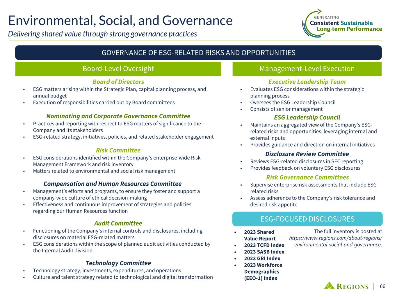 66 Environmental, Social, and Governance Delivering shared value through strong governance practices GOVERNANCE OF ESG-RELATED RISKS AND OPPORTUNITIES Board-Level Oversight Board of Directors • ESG matters arising within the Strategic Plan, capital planning process, and annual budget • Execution of responsibilities carried out by Board committees Compensation and Human Resources Committee • Management’s efforts and programs, to ensure they foster and support a company-wide culture of ethical decision-making • Effectiveness and continuous improvement of strategies and policies regarding our Human Resources function Nominating and Corporate Governance Committee • Practices and reporting with respect to ESG matters of significance to the Company and its stakeholders • ESG-related strategy, initiatives, policies, and related stakeholder engagement Management-Level Execution Risk Committee • ESG considerations identified within the Company’s enterprise-wide Risk Management Framework and risk inventory • Matters related to environmental and social risk management Audit Committee • Functioning of the Company’s internal controls and disclosures, including disclosures on material ESG-related matters • ESG considerations within the scope of planned audit activities conducted by the Internal Audit division Technology Committee • Technology strategy, investments, expenditures, and operations • Culture and talent strategy related to technological and digital transformation Executive Leadership Team • Evaluates ESG considerations within the strategic planning process • Oversees the ESG Leadership Council • Consists of senior management ESG Leadership Council • Maintains an aggregated view of the Company’s ESG- related risks and opportunities, leveraging internal and external inputs • Provides guidance and direction on internal initiatives Risk Governance Committees • Supervise enterprise risk assessments that include ESG- related risks • Assess adherence to the Company’s risk tolerance and desired risk appetite ESG-FOCUSED DISCLOSURES • 2023 Shared Value Report • 2023 TCFD Index • 2023 SASB Index • 2023 GRI Index • 2023 Workforce Demographics (EEO-1) Index The full inventory is posted at https://www.regions.com/about-regions/ environmental-social-and-governance. Disclosure Review Committee • Reviews ESG-related disclosures in SEC reporting • Provides feedback on voluntary ESG disclosures